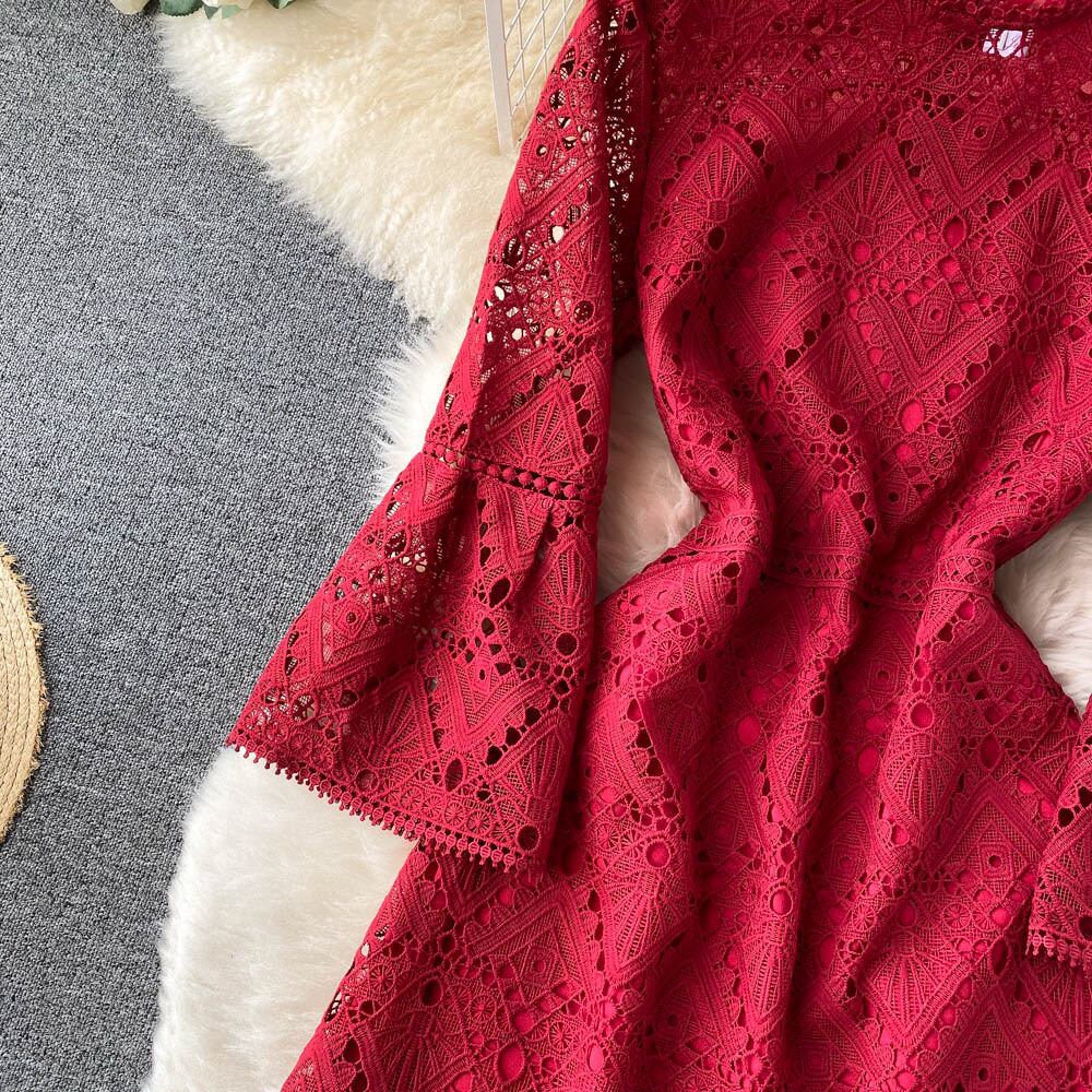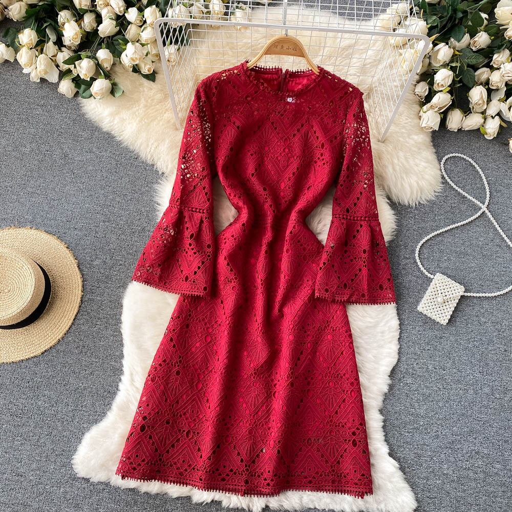 and gentle wind French retro lace dress women waist slim bell sleeves mid-length temperament A-line skirt ベルスリーブ レトロ レース スカート Aライン スリム lyxaj12574813296