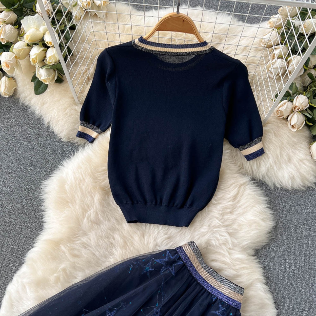 Gentle style retro suit skirt short knitted contrast color top women's design embroidery mesh skirt two-piece set ショート レトロ 刺繍 メッシュ スカート lyxaj23490432207
