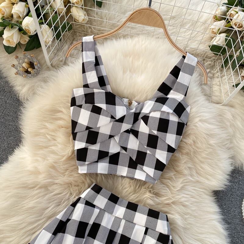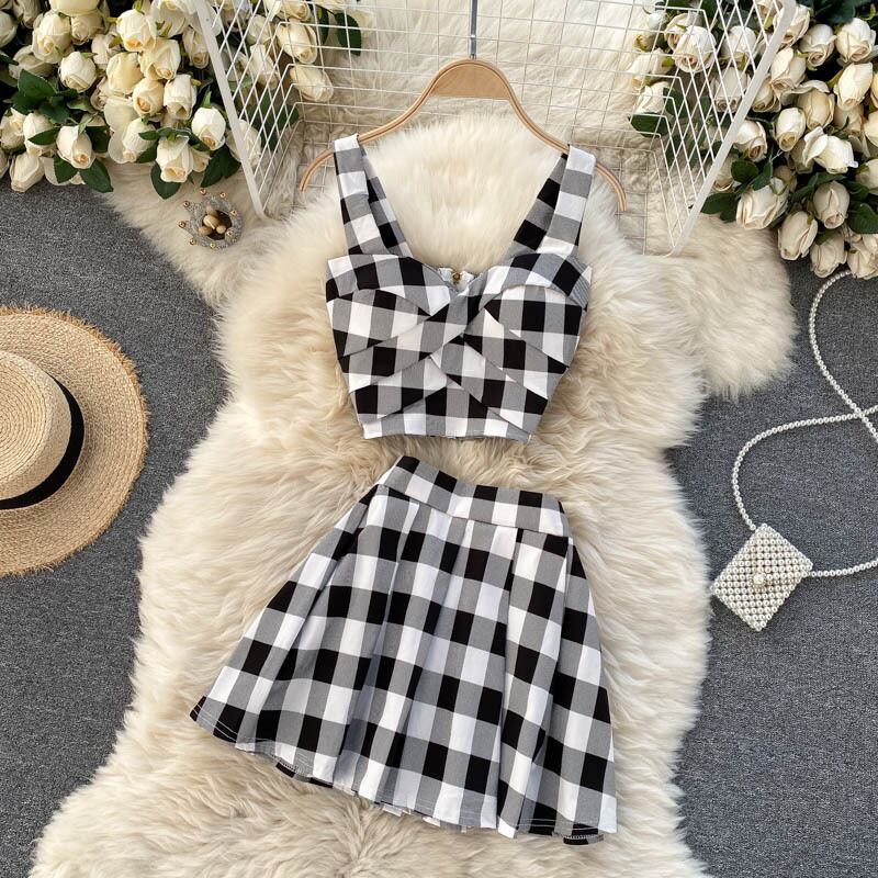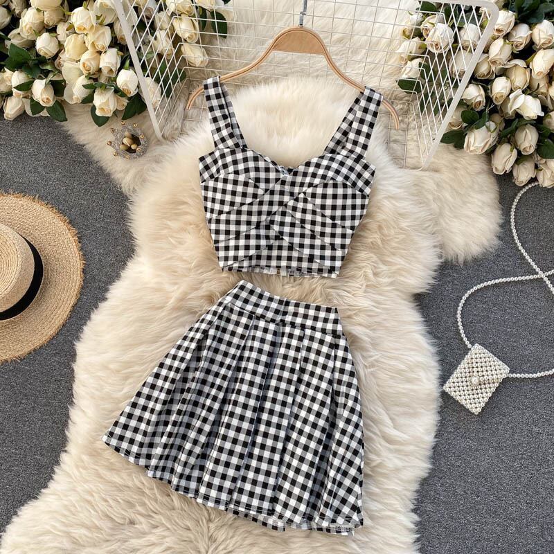 version of the fashionable sweet little man suit plaid V-neck camisole top high waist pleated skirt two-piece set ハイウェスト 大人ガーリー スウィート キュート カジュアル プリーツ スカート Vネック lyxaj28487752572