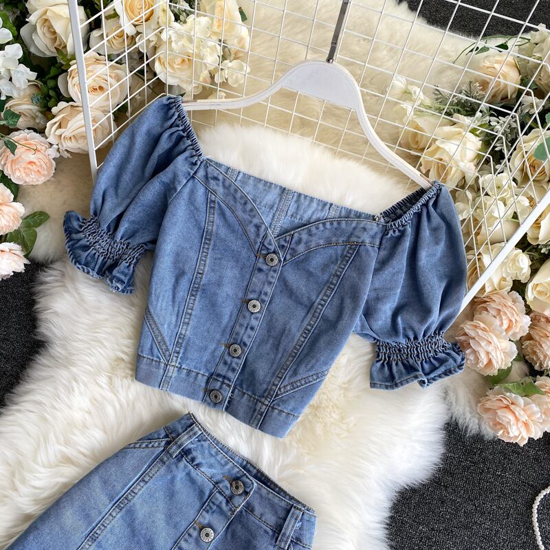 Hong Kong style retro denim suit 2020 new women's one-shoulder top short high waist skirt two-piece trend ハイウェスト ショート レトロ スカート lyxaj29397116588