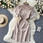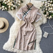 Retro plaid skirt, improved cheongsam, stand-up collar, disc button, wood ear, short-sleeved waist, thin slit, contrast color dress レトロ スカート lyxaj36419770664