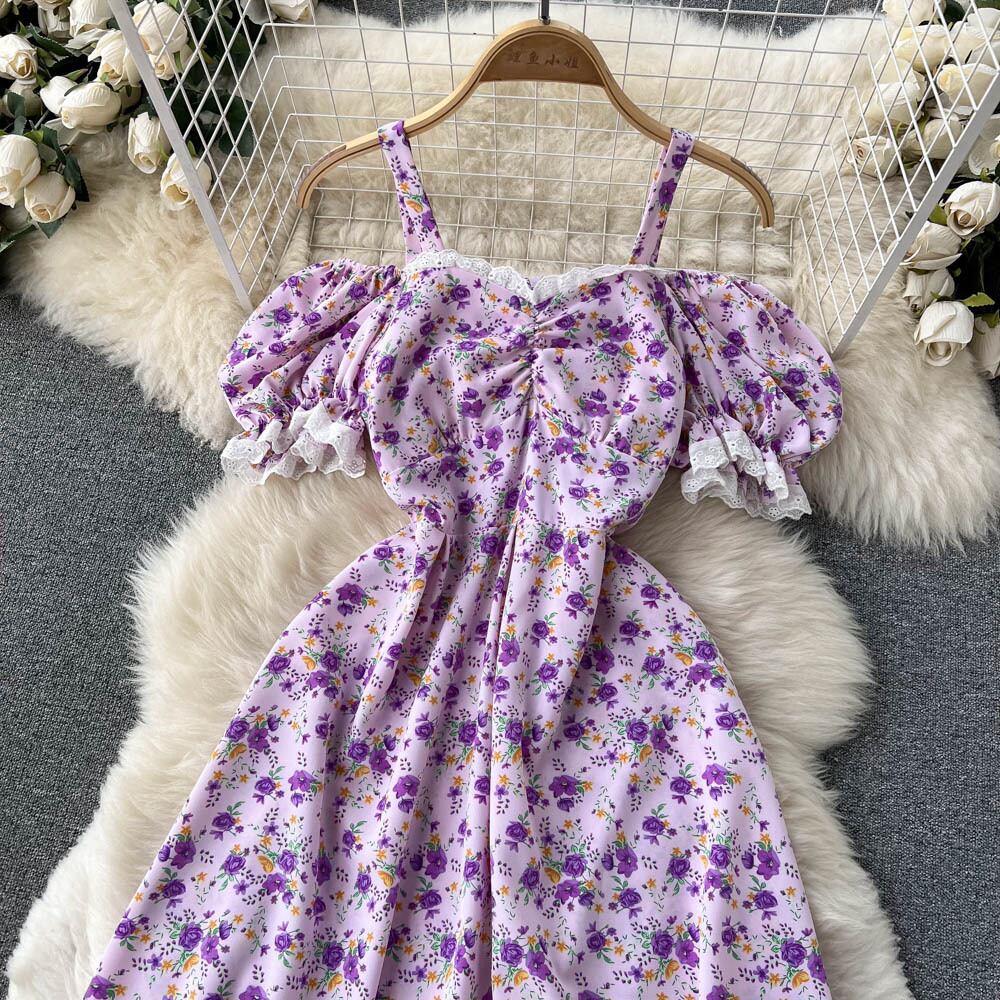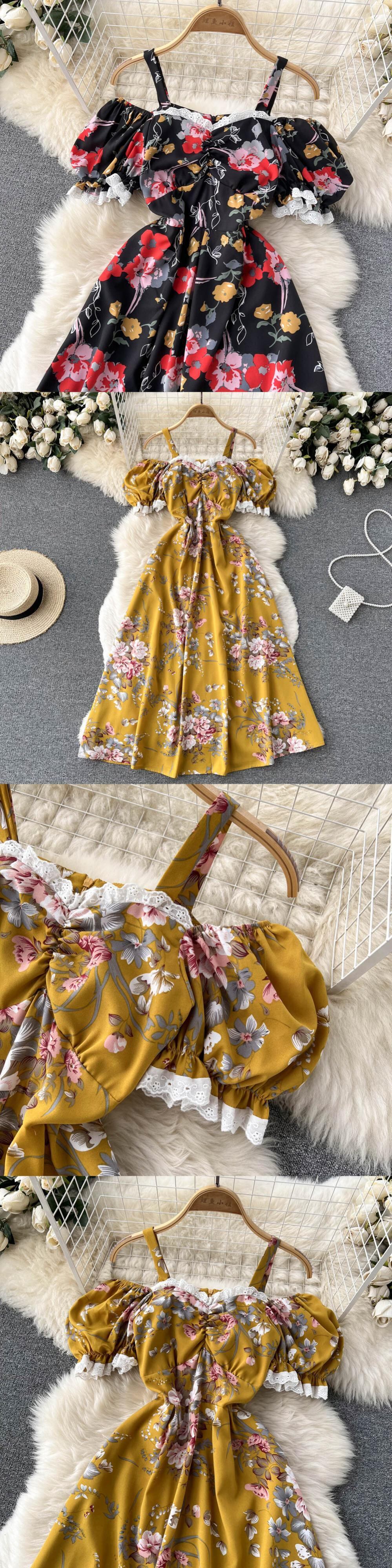 Seaside holiday beach floral one-shoulder off-the-shoulder sling long dress high-end waist slim A-line dress summer ロング サマー 夏物 ビーチ 花柄 Aライン スリム lyxaj69050788389
