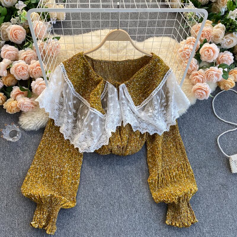 Fairy lace lace ruffled large lapel Western-style puff sleeves pleated floral chiffon shirt age-reducing top women's tide シフォン レース プリーツ 花柄 lyxaj68770850370