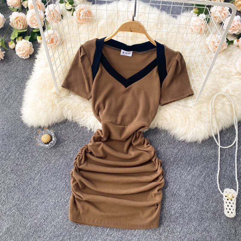 sense niche French puff sleeve V-neck short-sleeved pleated waist sexy summer chic hip dress プリーツ サマー 夏物 Vネック lyxaj28209495819