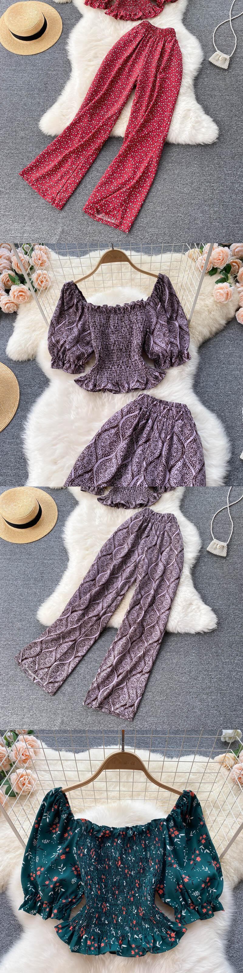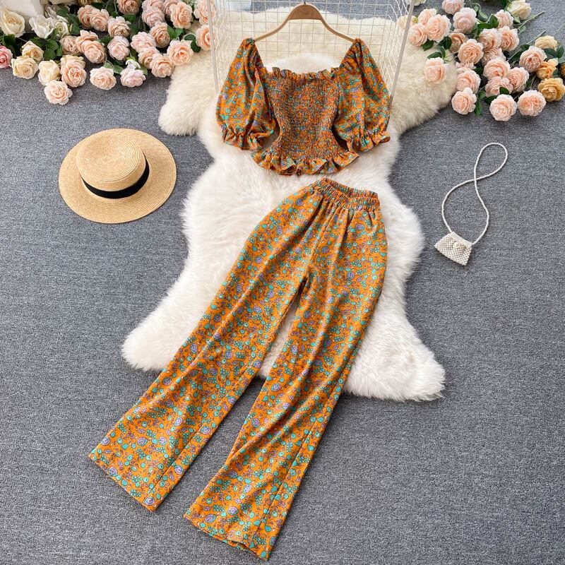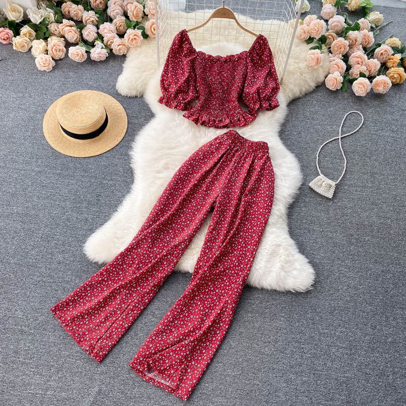 Hong Kong-flavored floral suit female 2021 new short square-neck top loose trousers wide-leg pants Western style two-piece set ショート レッド 花柄 スクウェア lyxaj97629674786