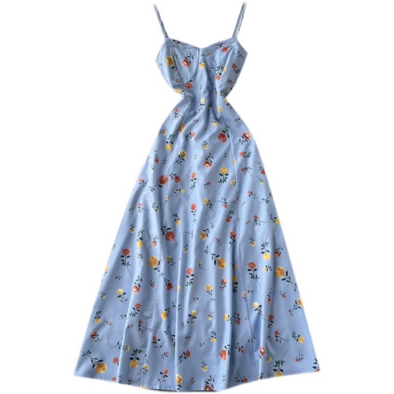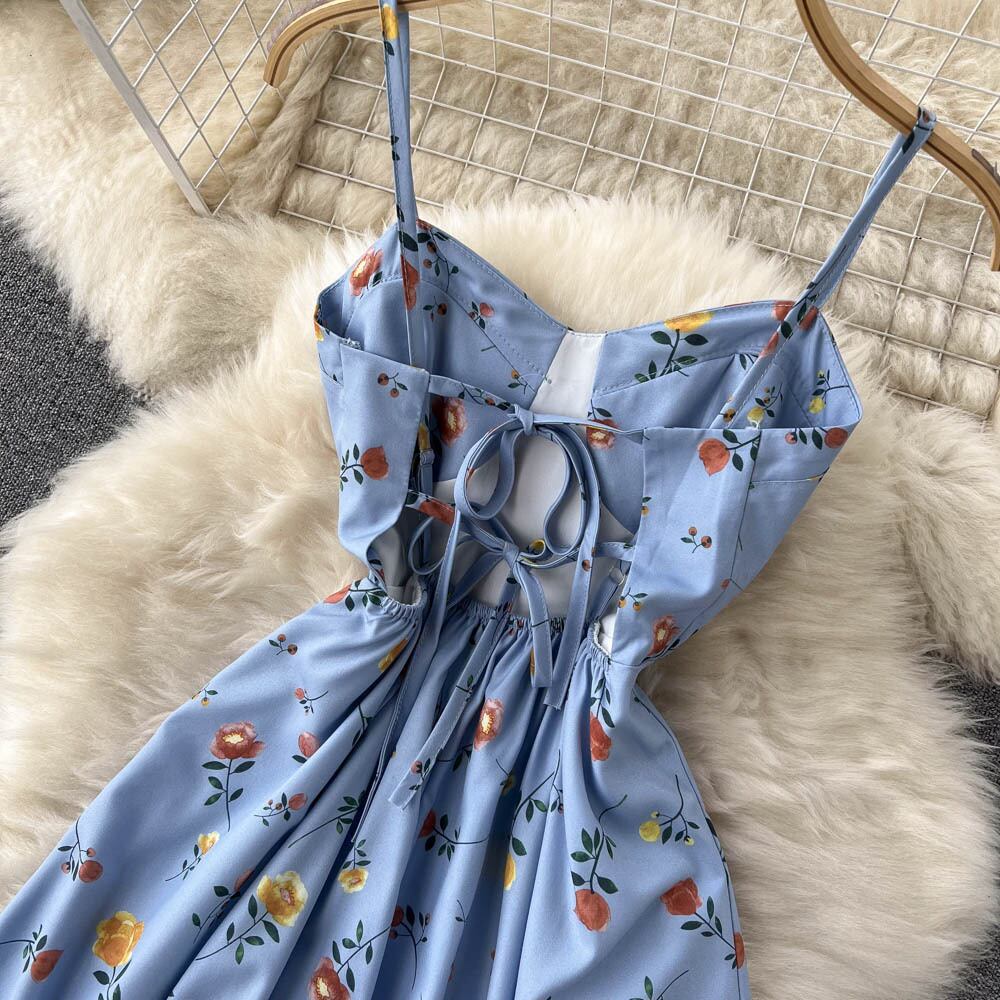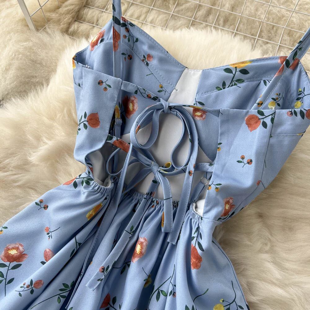 French small fresh floral dress gentle wind super fairy temperament V-neck fashion strapless backless seaside suspender skirt 花柄 スカート Vネック lyxaj55150064340