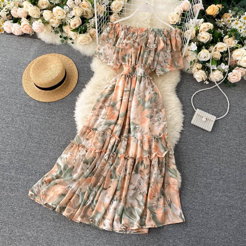 Holiday dress 2020 new summer sexy one-word neck off-the-shoulder ruffled long chiffon floral skirt ロング シフォン サマー 夏物 花柄 スカート lyxaj41244342690