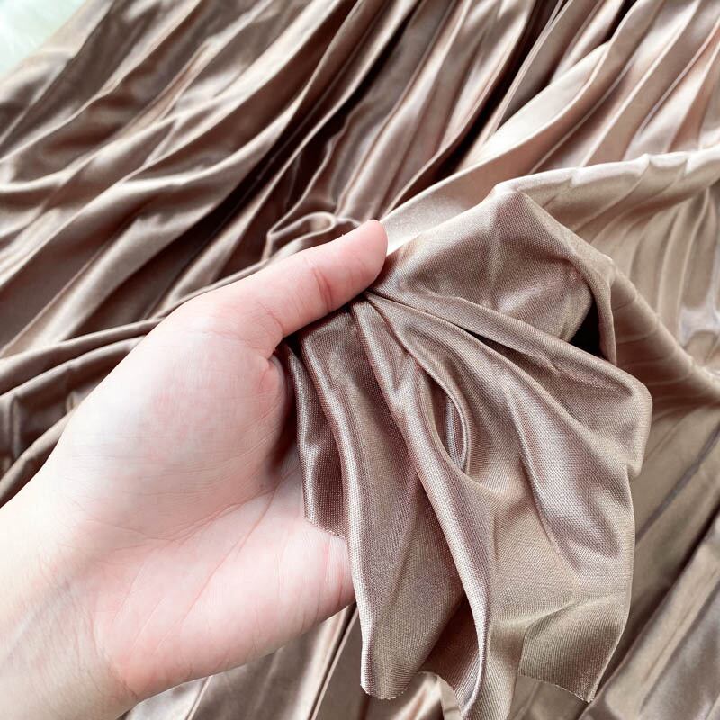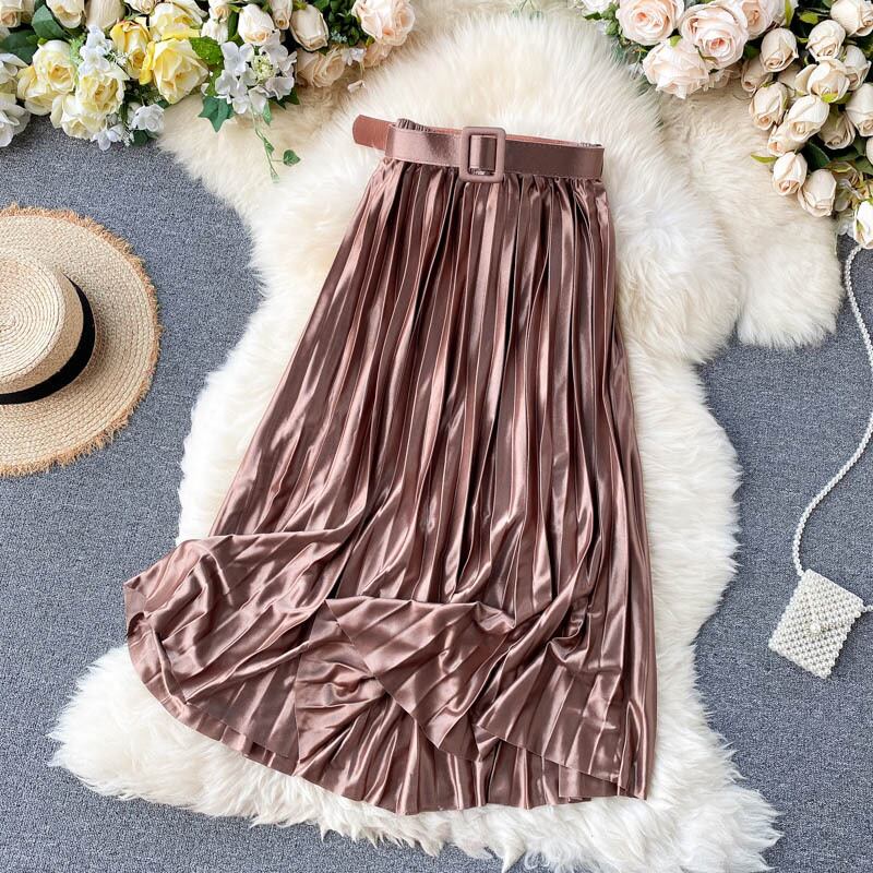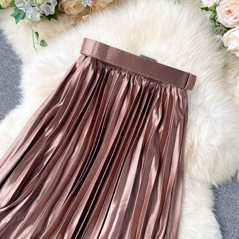 European and American ins design sense niche metal sense shiny surface pleated high waist thin elastic waist mid-length skirt ハイウェスト エラスティック 伸縮 プリーツ スカート ヨーロピアン lyxaj17614355115