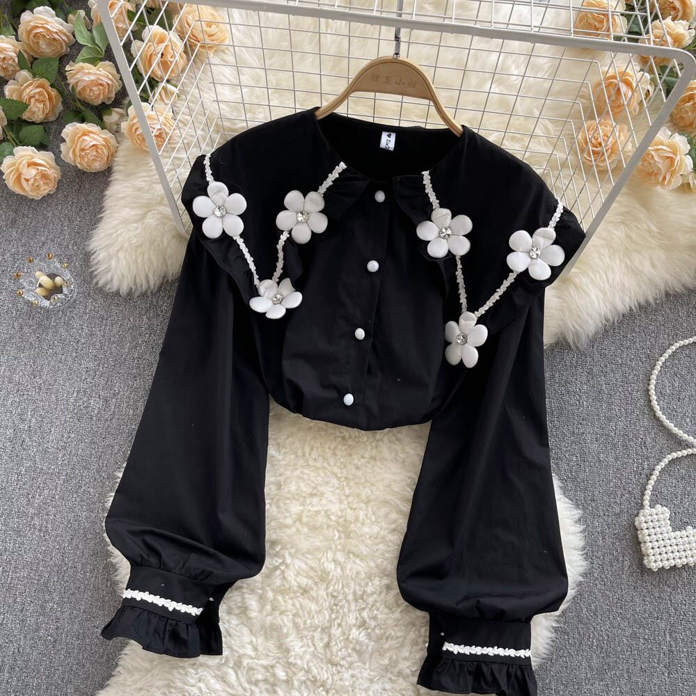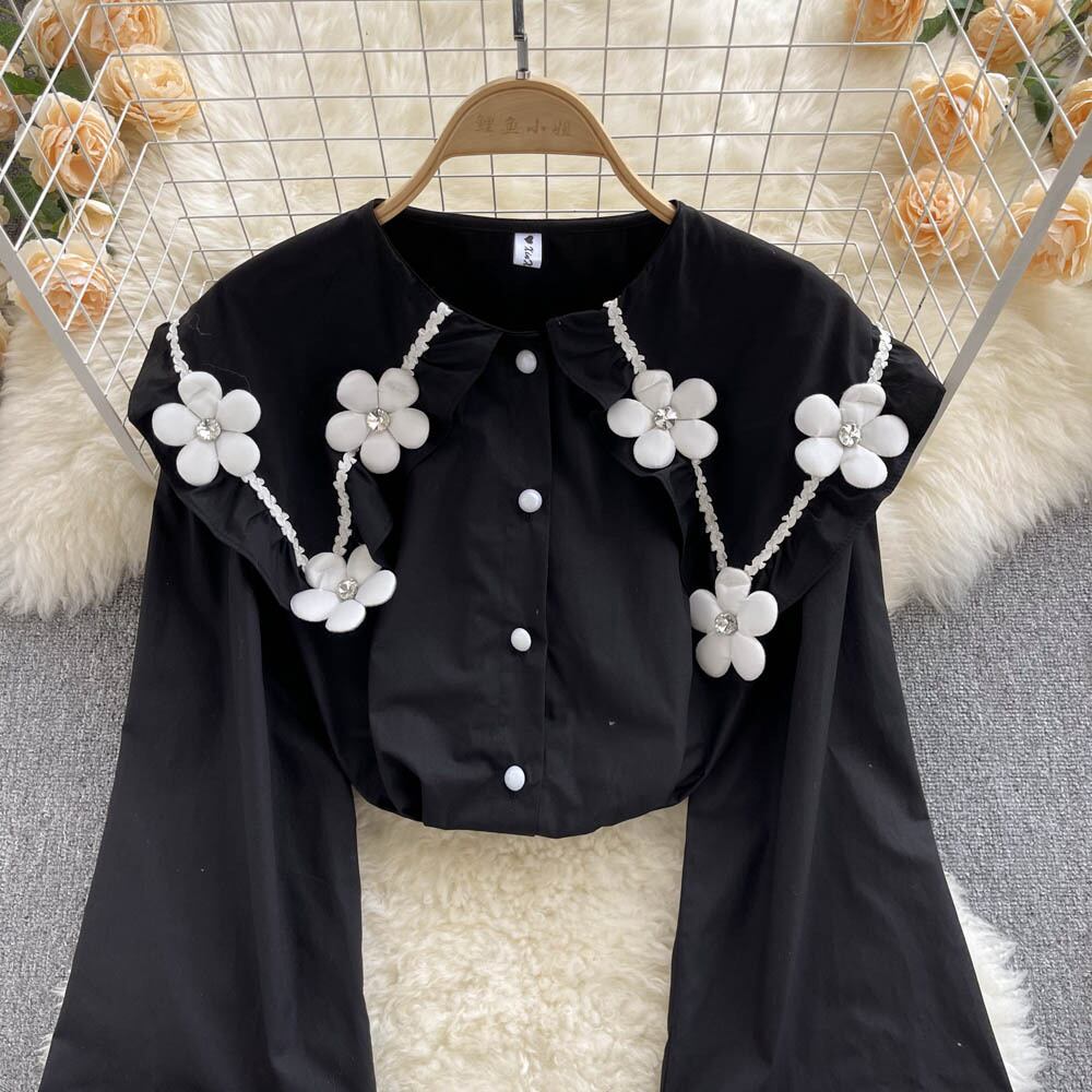 Sweet temperament three-dimensional flower doll collar shirt women's design sense niche puff sleeves Western-style age-reducing all-match shirt 大人ガーリー スウィート キュート カジュアル フラワーデザイン lyxaj68962229857