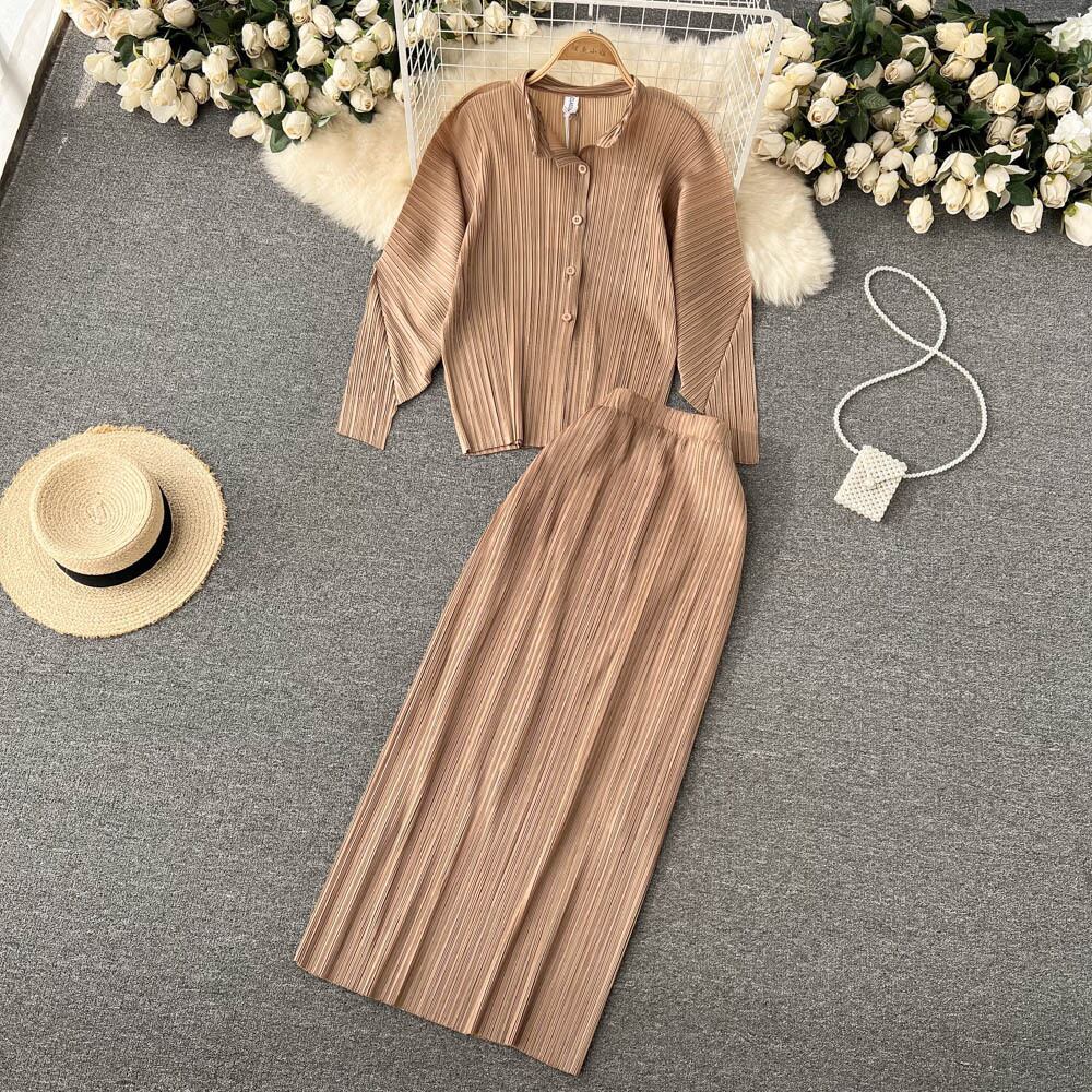 Suit Women's Pit Stripe Stand Collar Breasted Chic Shirt Waist Pack Hip Split Skirt Two Piece Set スカート ストライプ lyxaj98958942660