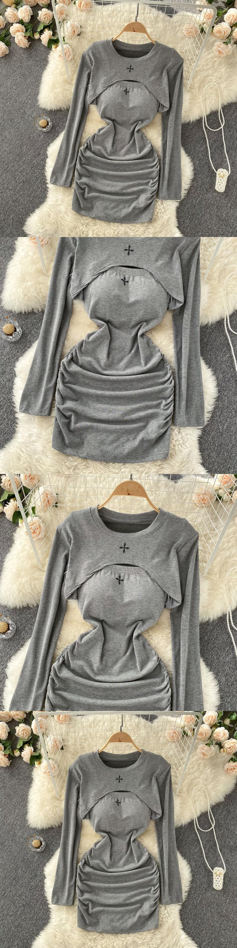 2022 spring new net red fake two-piece slim fit sexy hollow pleated bag hip niche long-sleeved dress ロング レッド プリーツ スプリング 春物 スリム lyxaj70687749802