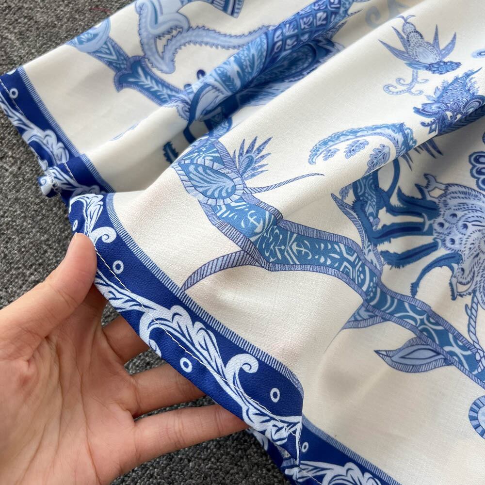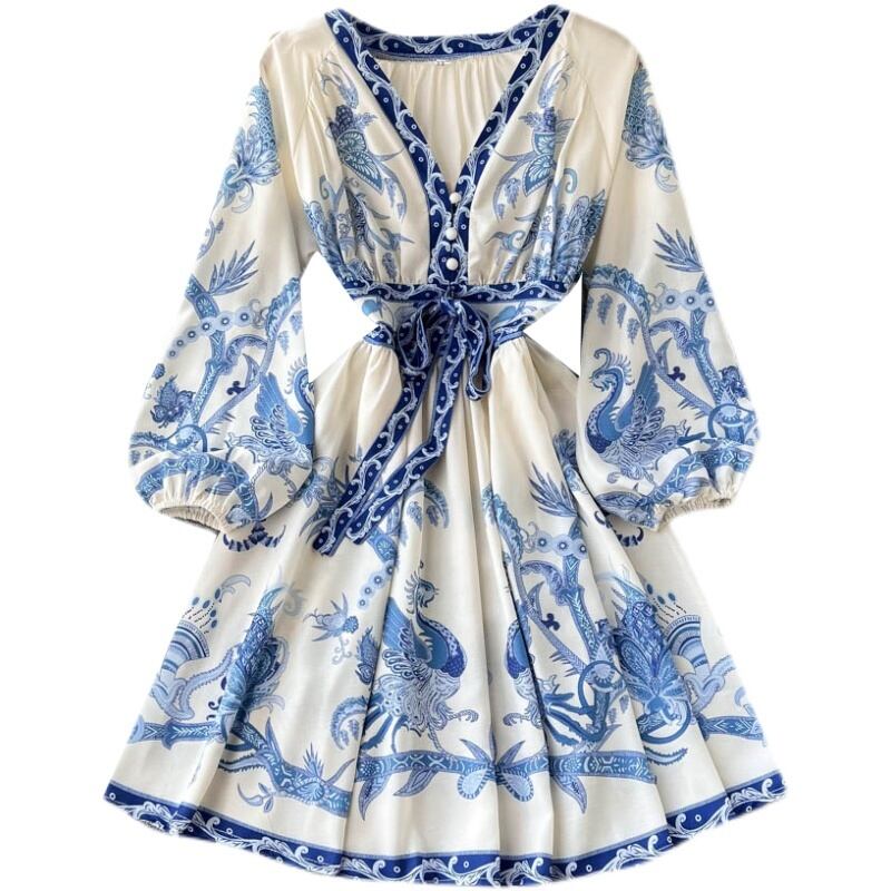 Palace retro temperament western style dress small tie waist V neck contrast printing lantern sleeve A-line skirt women ランタンスリーブ レトロ レース スカート Vネック Aライン lyxaj23775016297