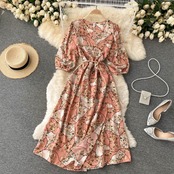 -end temperament goddess Fan Qingshu V-neck waist tie is thin and Western style retro age-reducing French first love floral dress レトロ 花柄 Vネック lyxaj54375795228