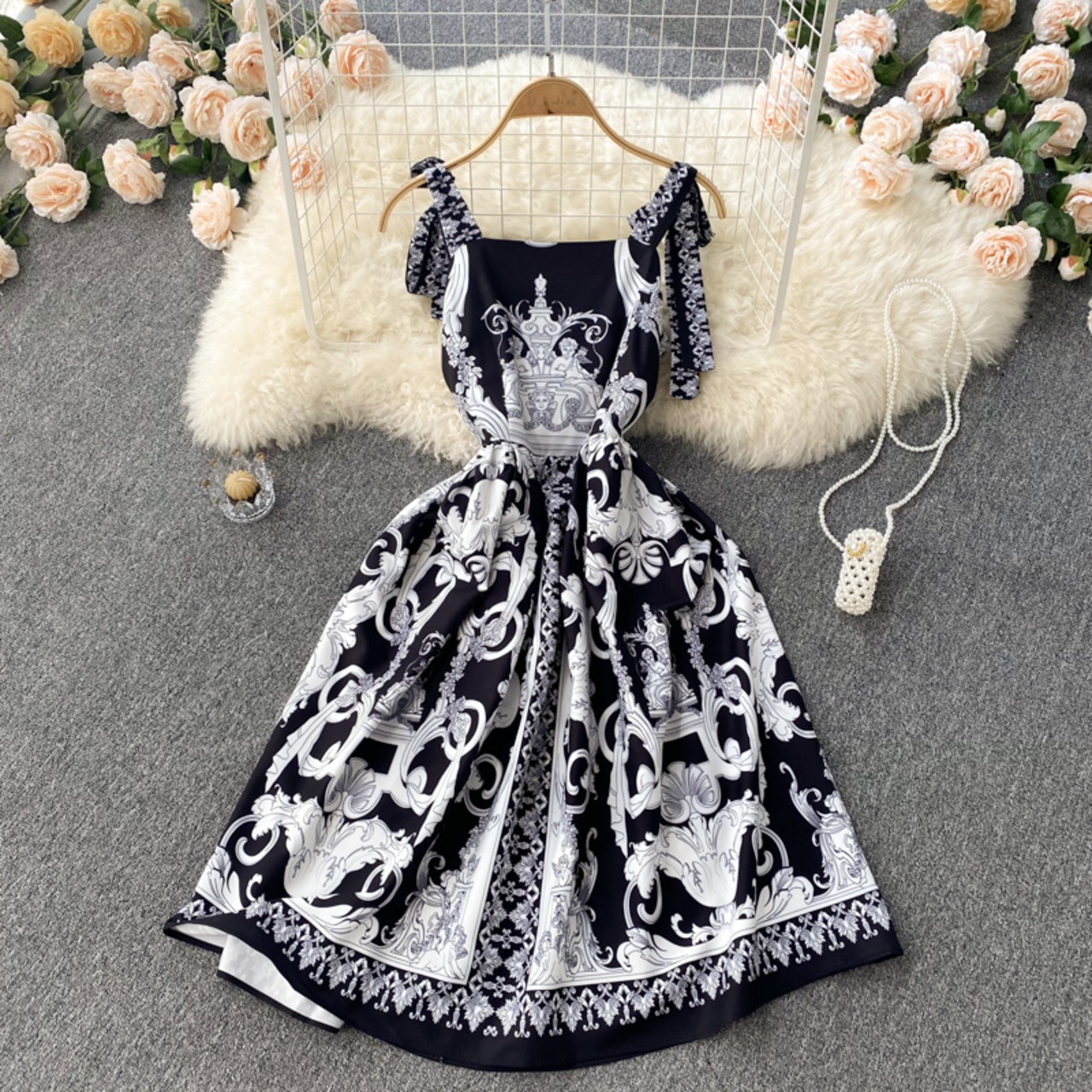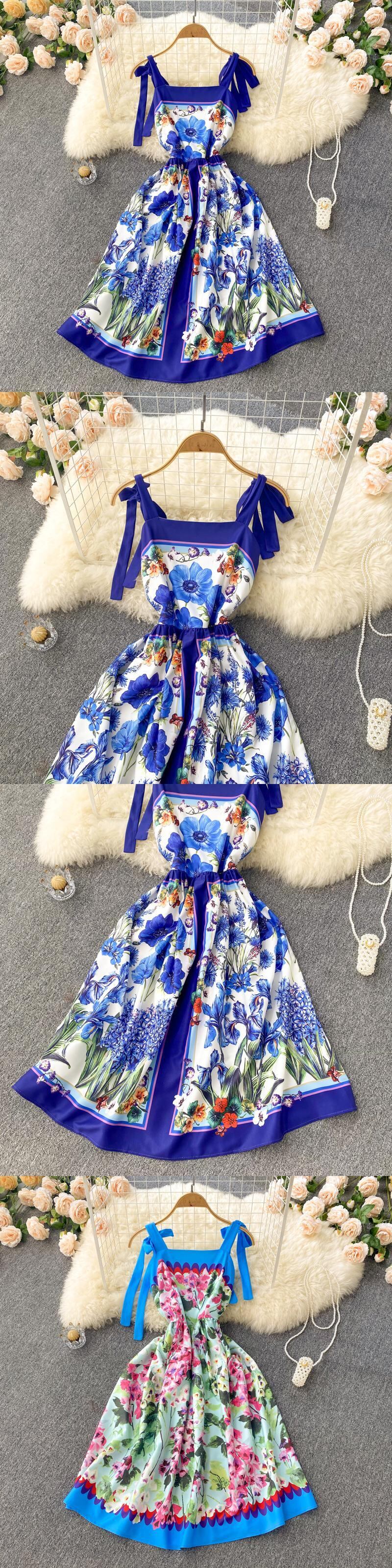 2022 spring and summer new palace style print straps slim fit and slim and swing holiday suspender skirt Western style dress レース スプリング 春物 サマー 夏物 スカート スリム lyxaj29820497082