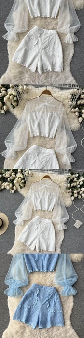 2022 spring suit women's design sense niche mesh puff sleeves stitching lace short tops and shorts two-piece set ショート レース スプリング 春物 メッシュ ショーツ ブルマー ステッチ lyxaj14420598845