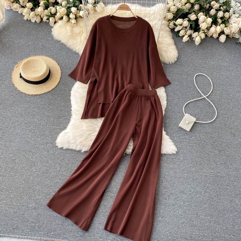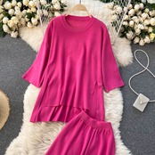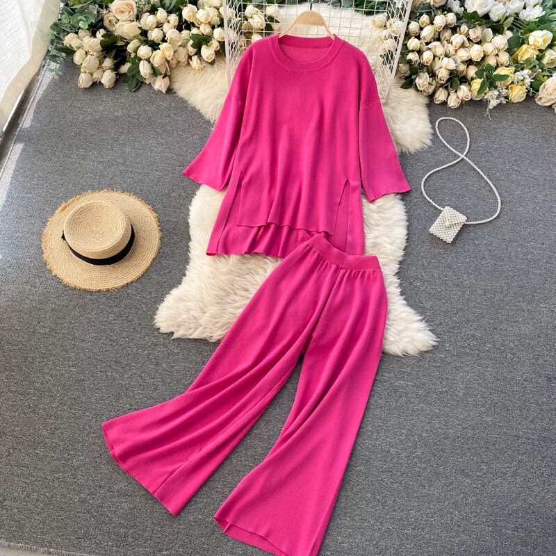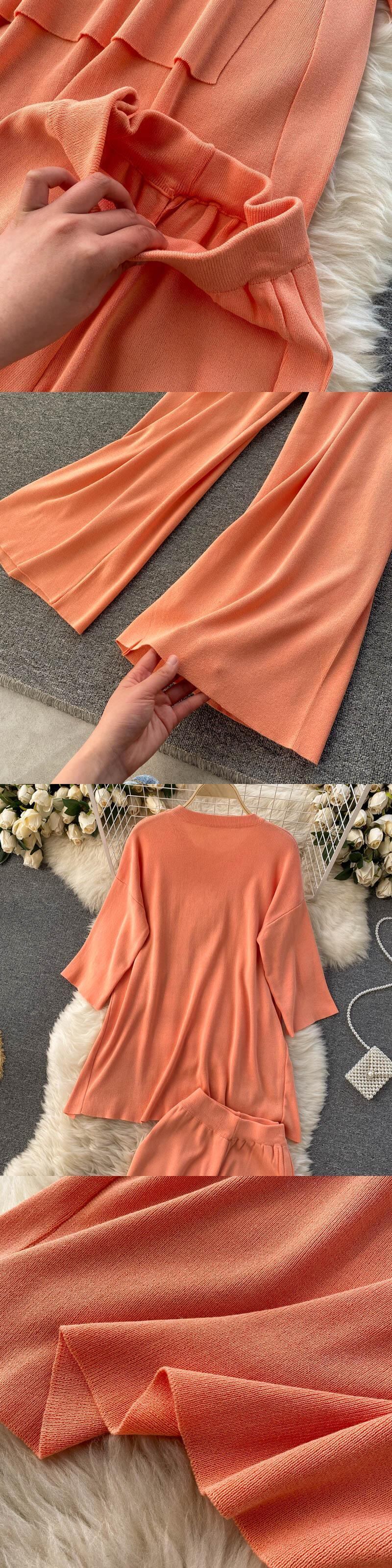 and smart literary fan side slit round neck mid-sleeve top women's high waist and thin casual wide-leg pants suit women ハイウェスト カジュアル Oネック lyxaj20853579725