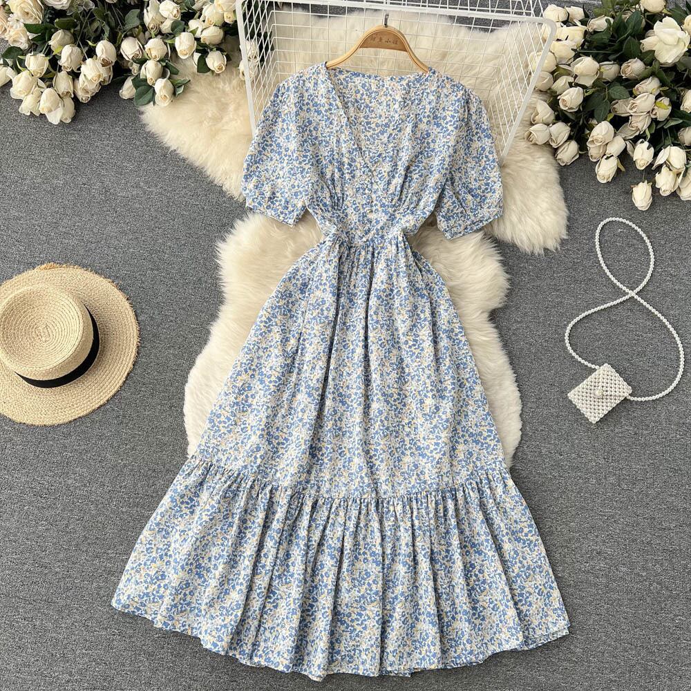 2022 summer new literary and artistic small fresh V-neck chiffon floral dress French waist slim and large swing skirt シフォン サマー 夏物 花柄 スカート Vネック スリム lyxaj59823396511