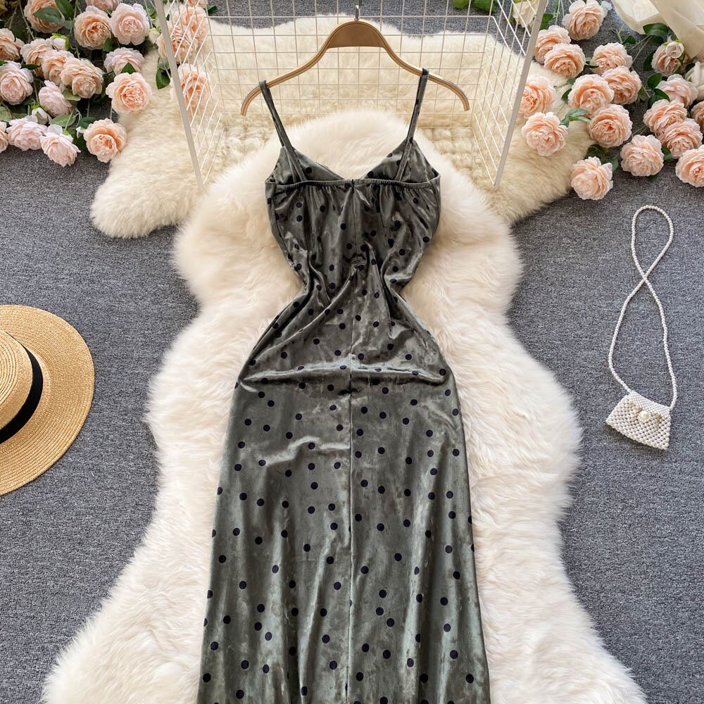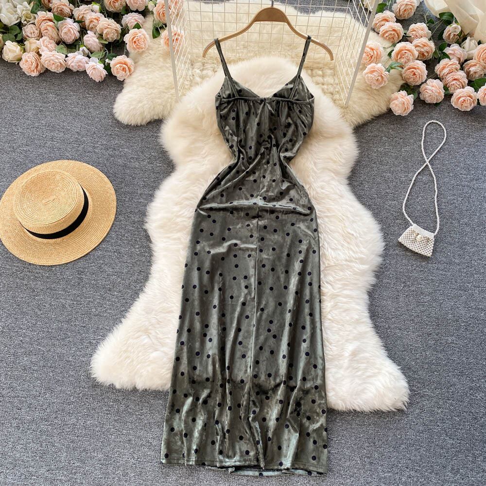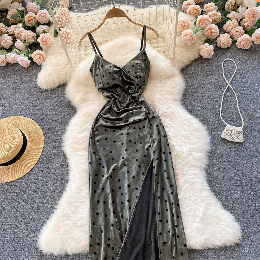 Celebrity high-end V-neck temperament evening dress French retro velvet slit sexy suspender skirt slim dress レトロ スカート Vネック スリム lyxaj74372380203