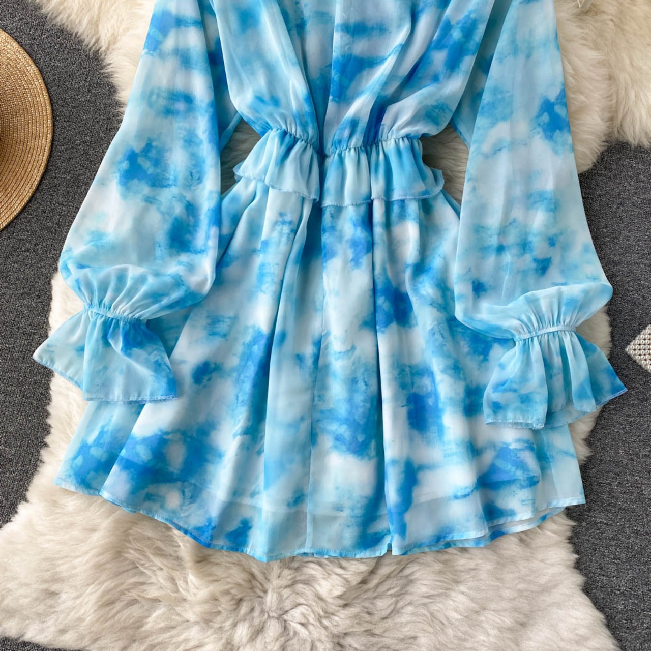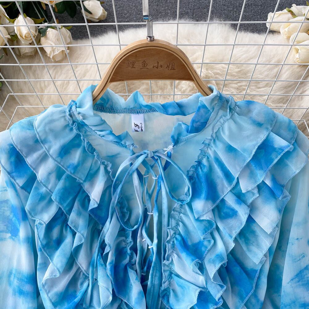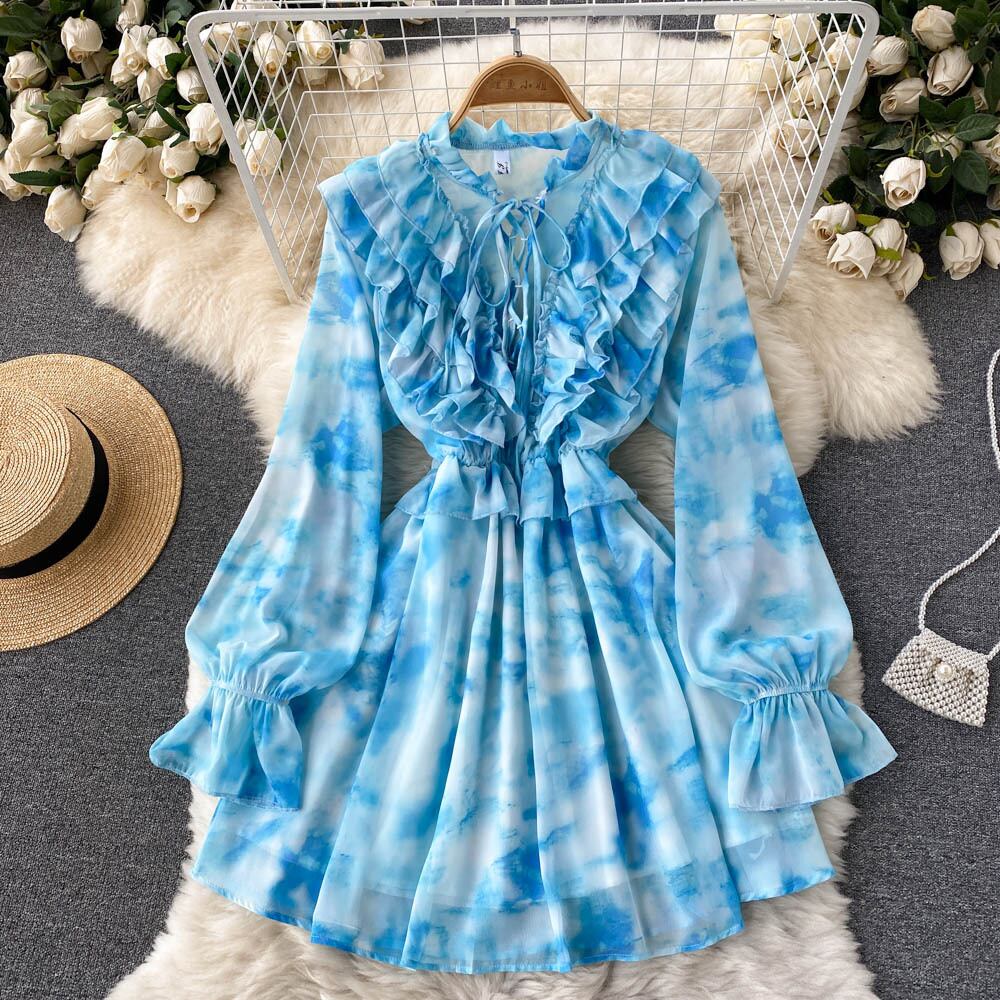 Retro tie-dye ruffled stitching design sense French waist dress small super fairy temperament chiffon skirt シフォン レトロ スカート ステッチ lyxaj86689028495