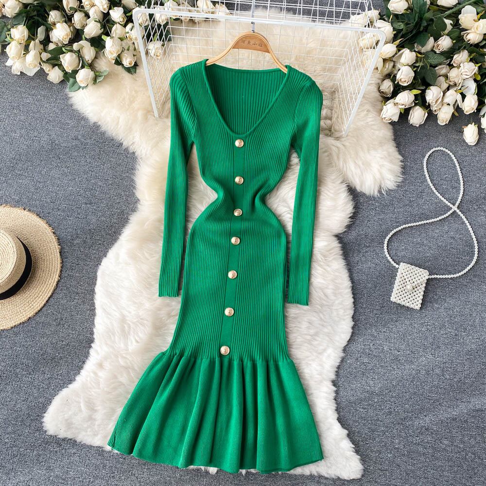 Celebrity temperament V-neck long-sleeved bottoming knitted dress women's tight-fitting bag buttocks slim mid-length fishtail sweater dress ロング Vネック スリム lyxaj35416945278