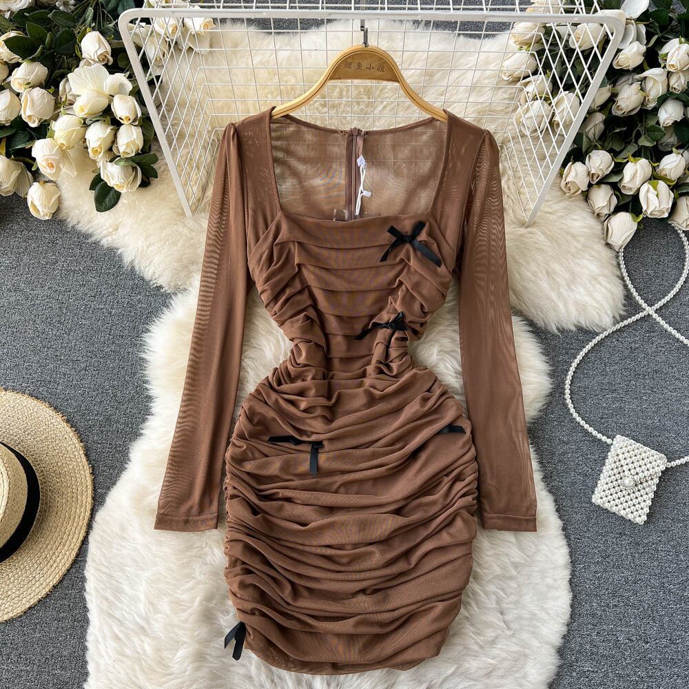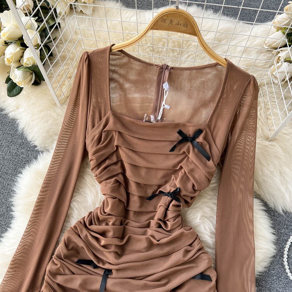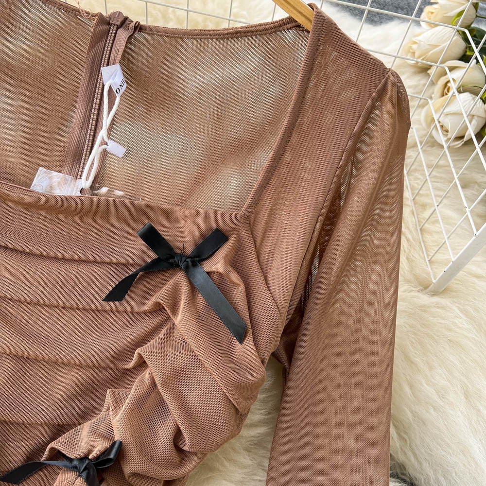 2022 spring new niche design sense square neck mesh bow dress is thin and pleated pure desire short skirt ショート リボン プリーツ スプリング 春物 メッシュ スカート ピュア スクウェア lyxaj35021913596