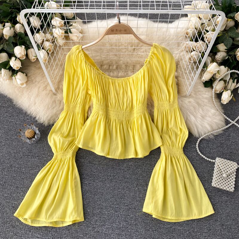 Short Bubble Trumpet Sleeve Top Autumn Style Clavicle Solid Color Shirt Version Thin and Versatile Small Shirt Women ショート オータム 秋物 ソリッドカラー lyxaj94308379651