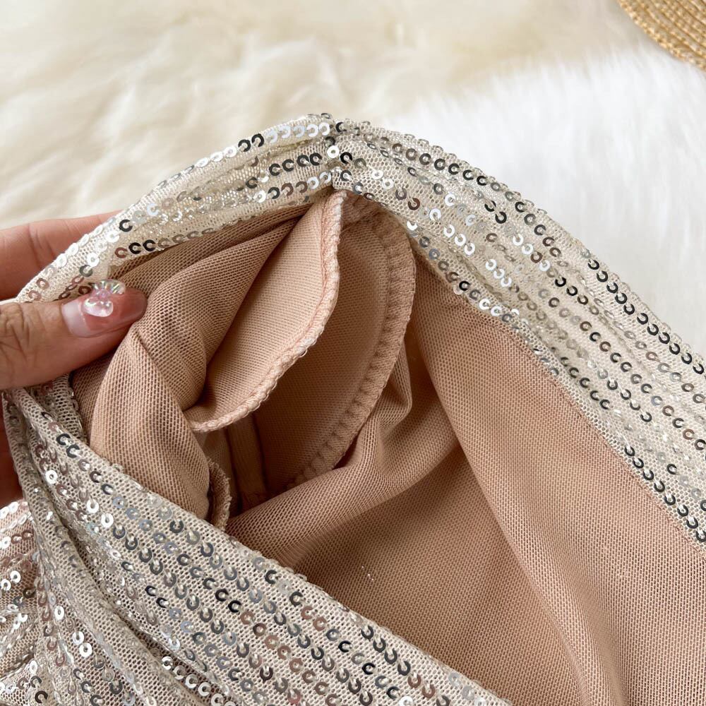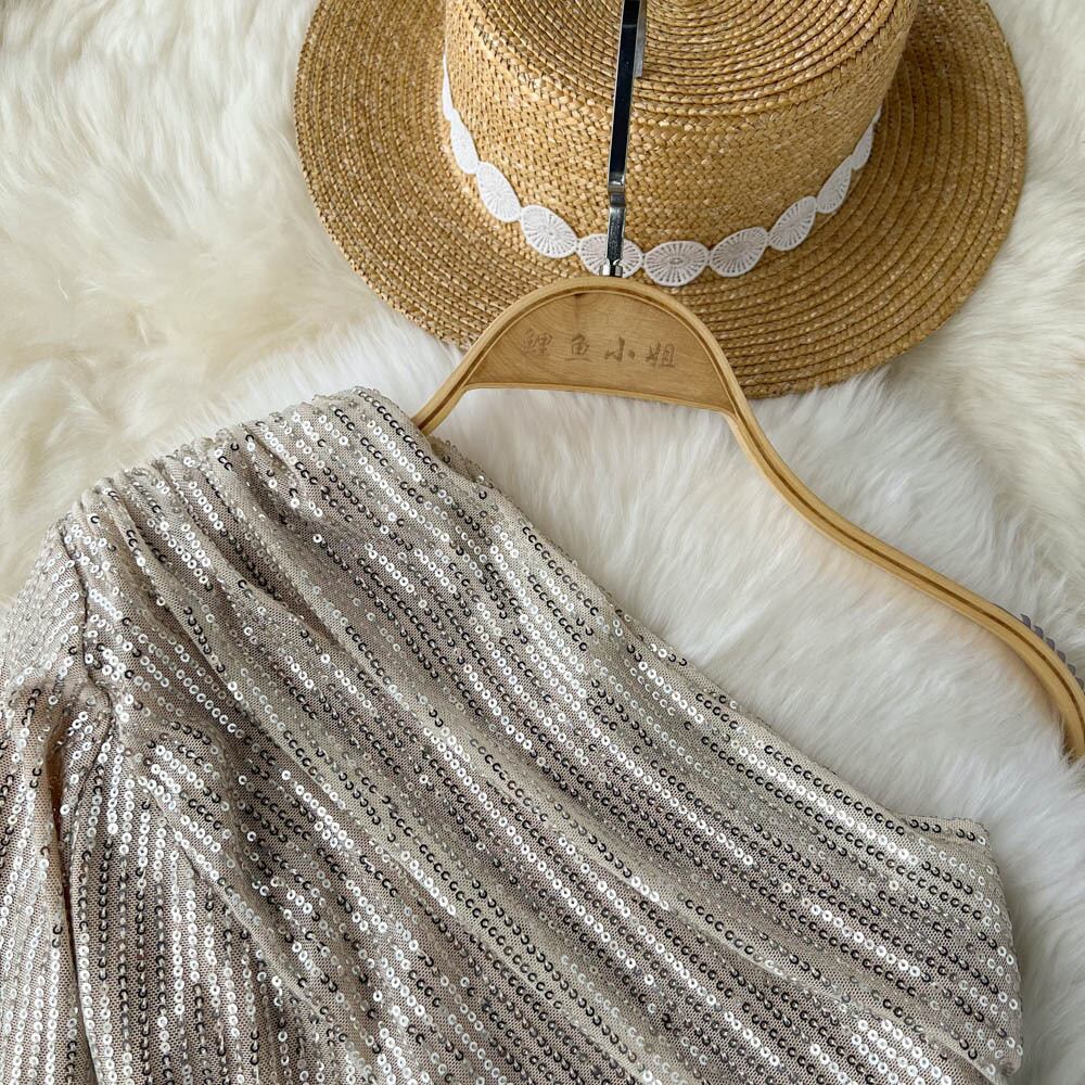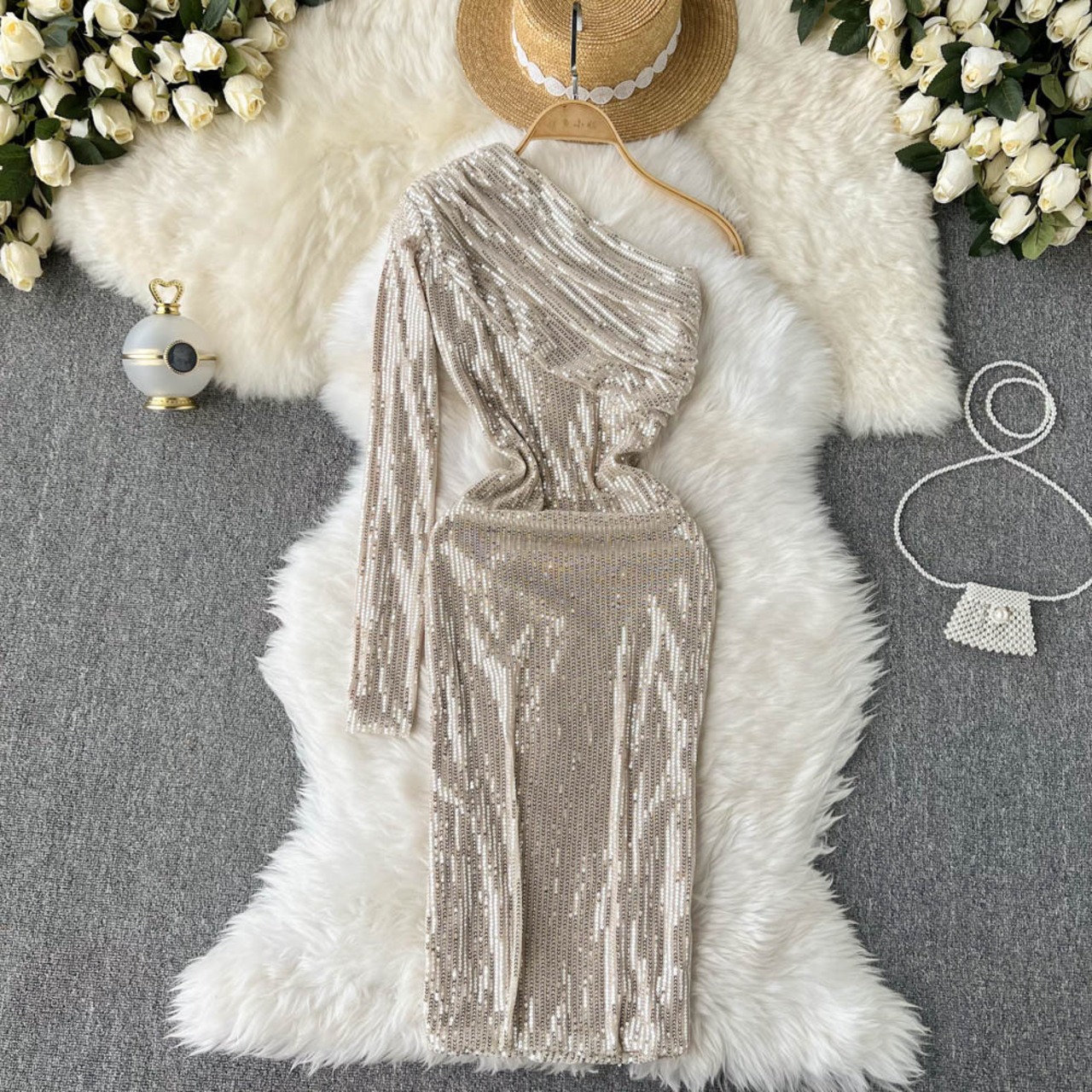 -end evening dress ladies elegant temperament off-the-shoulder light luxury sequins slim fit and slim bag hip French waist dress エレガント スリム lyxaj95443591644