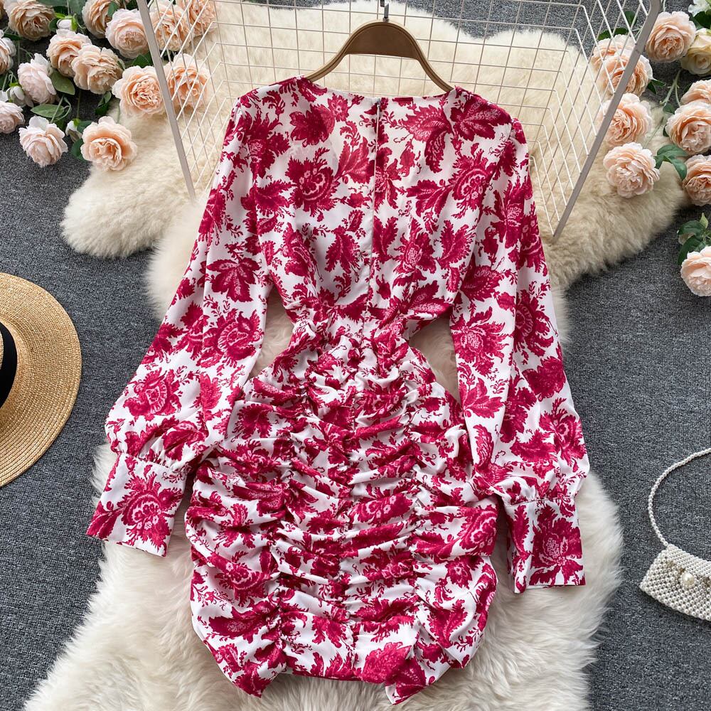 European and American ins women's new 2021 style sexy deep V-neck scheming pleated self-contained hip print dress women プリーツ Vネック ヨーロピアン lyxaj32239097923