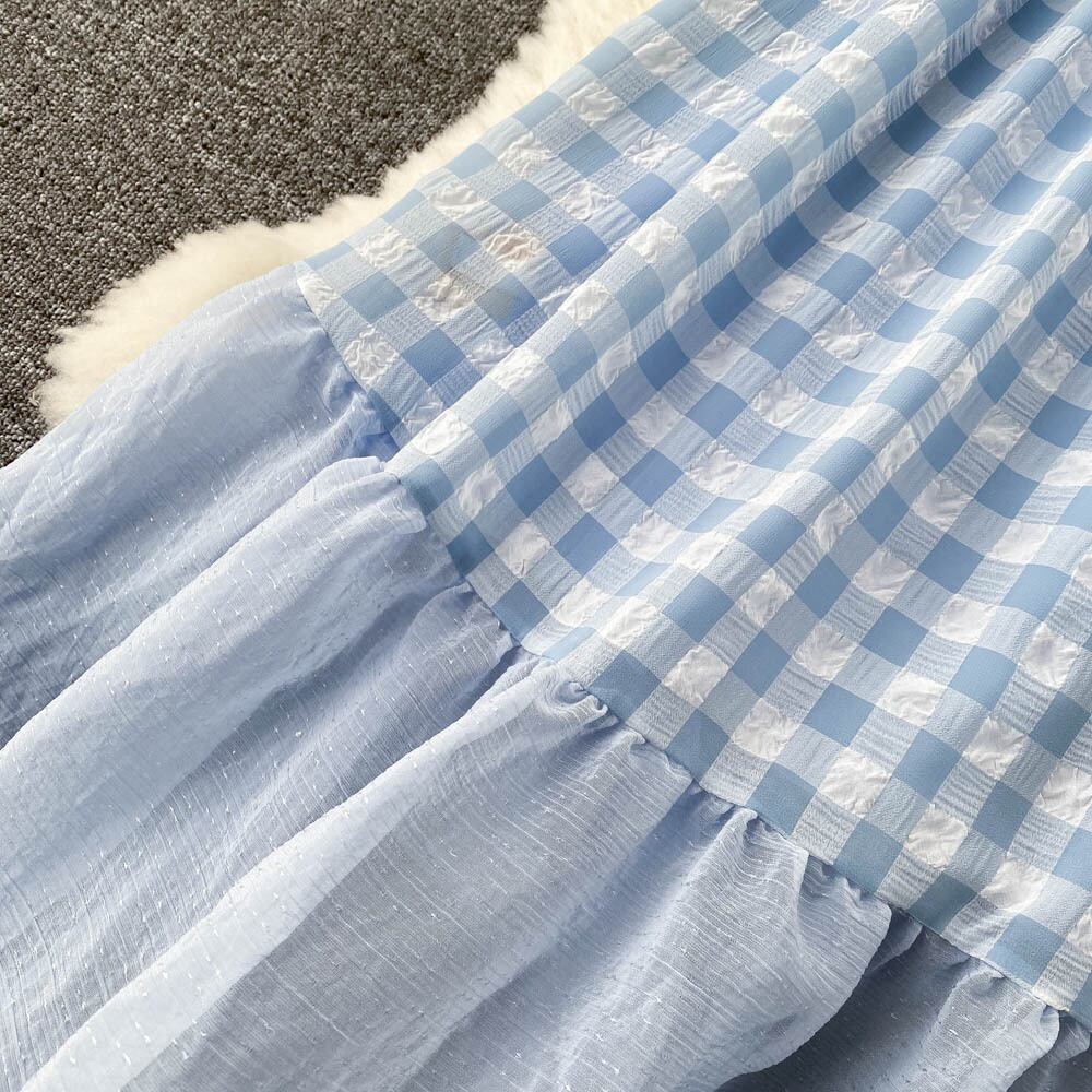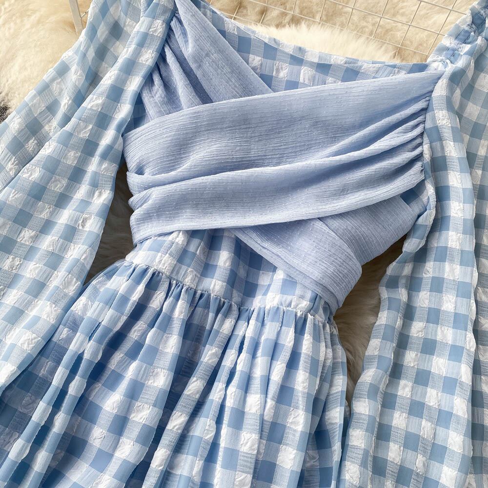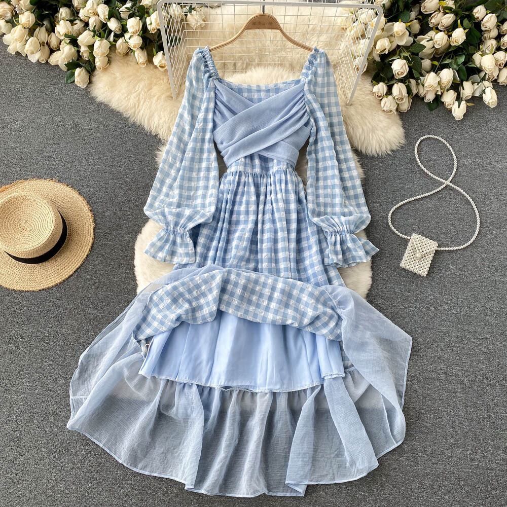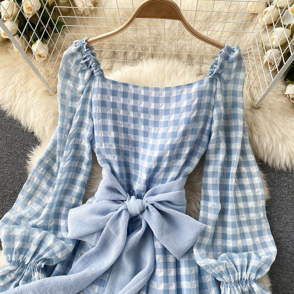 Gentle style square neck lantern sleeve plaid dress Western style age-reducing waist and thin French retro fairy skirt ランタンスリーブ レトロ スカート スクウェア lyxaj85761119720