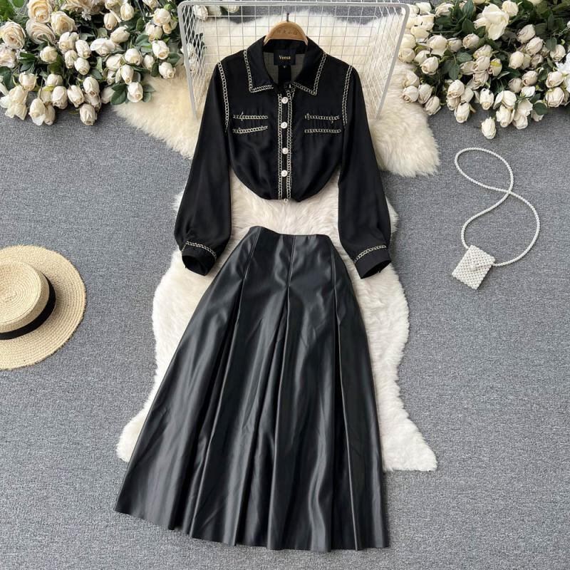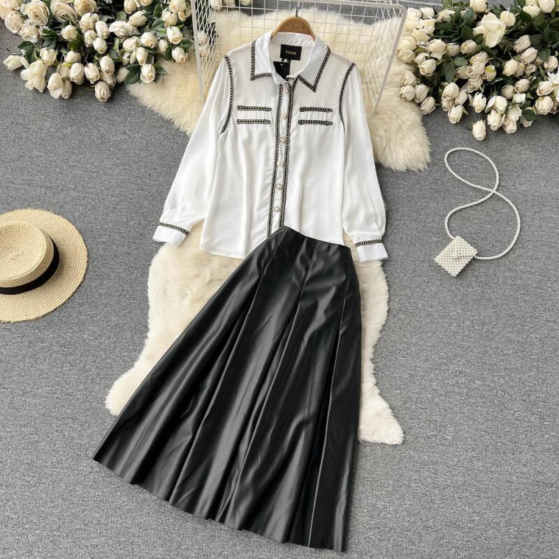 European fashion slim fit all-match chiffon shirt suit skirt skirt leather skirt women's fried street two-piece set 2022 spring and autumn シフォン ストリート スプリング 春物 オータム 秋物 レザー スカート スリム ヨーロピアン lyxaj12672303841