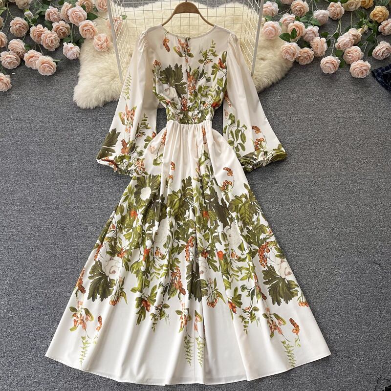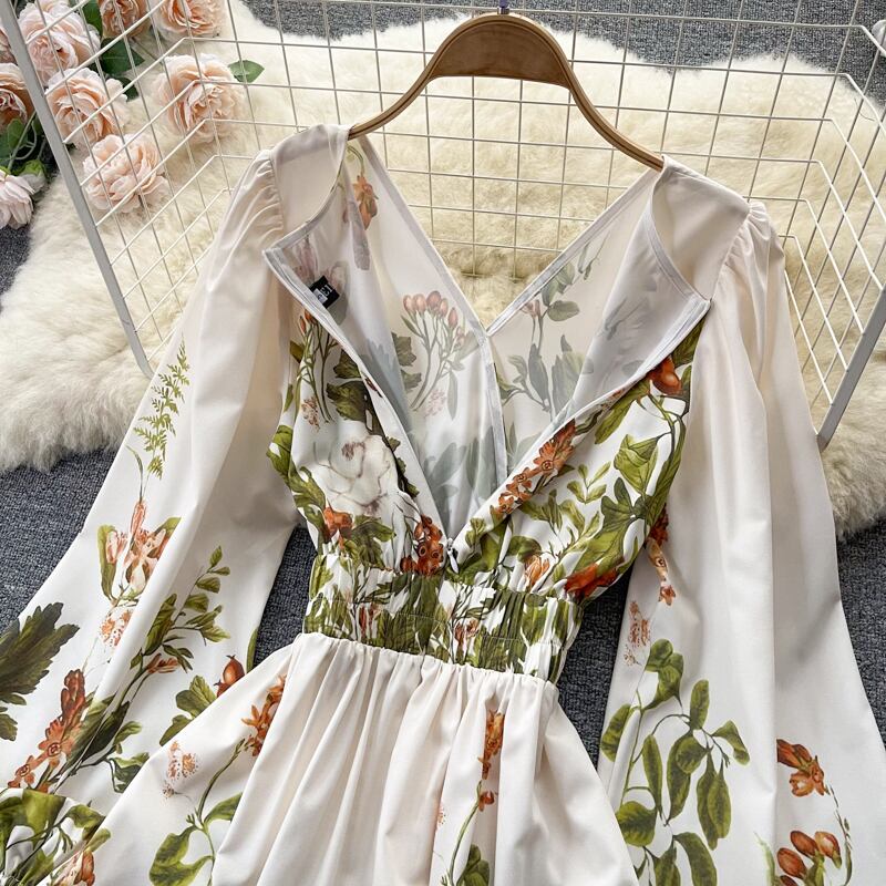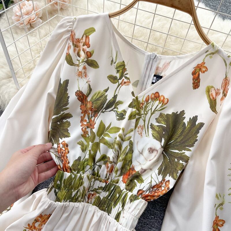 French V-neck floral lantern sleeve dress female elegant temperament Royal sister goddess Fan high waist was thin and long skirt ハイウェスト ロング ランタンスリーブ エレガント 花柄 スカート Vネック lyxaj78758104807