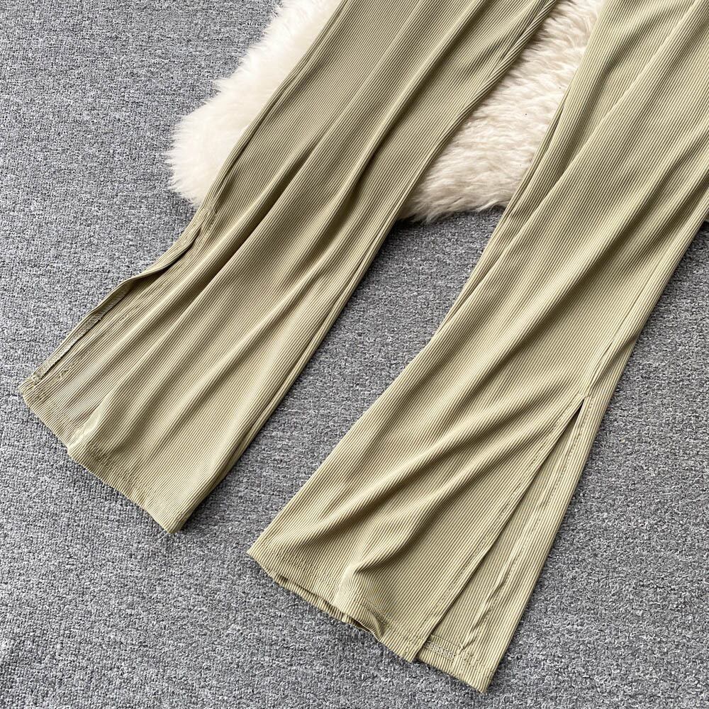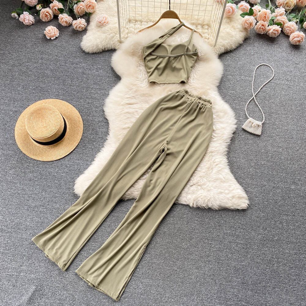 Hot suit women's design sense off-shoulder short suspender top elastic waist tie split straight trousers two-piece set ショート エラスティック 伸縮 オフショルダー lyxaj26360770758