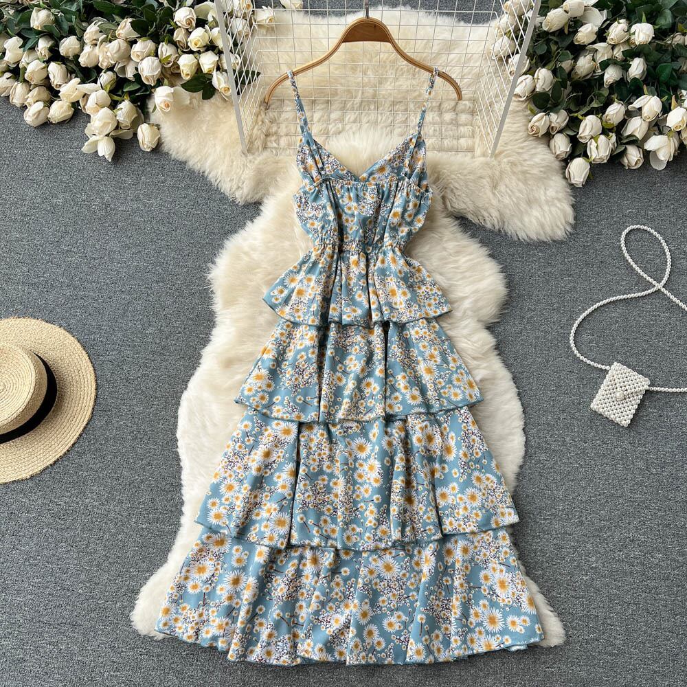 French Sling Dress Women's 2022 Summer Hepburn Floral Skirt Sense Long Skirt Cake Skirt ロング サマー 夏物 花柄 スカート lyxaj31373927152