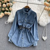 Hong Kong style shirt women's lace-up waist mid-length thin temperament POLO collar retro single-breasted style denim jacket レトロ レース レースアップ lyxaj24781570820