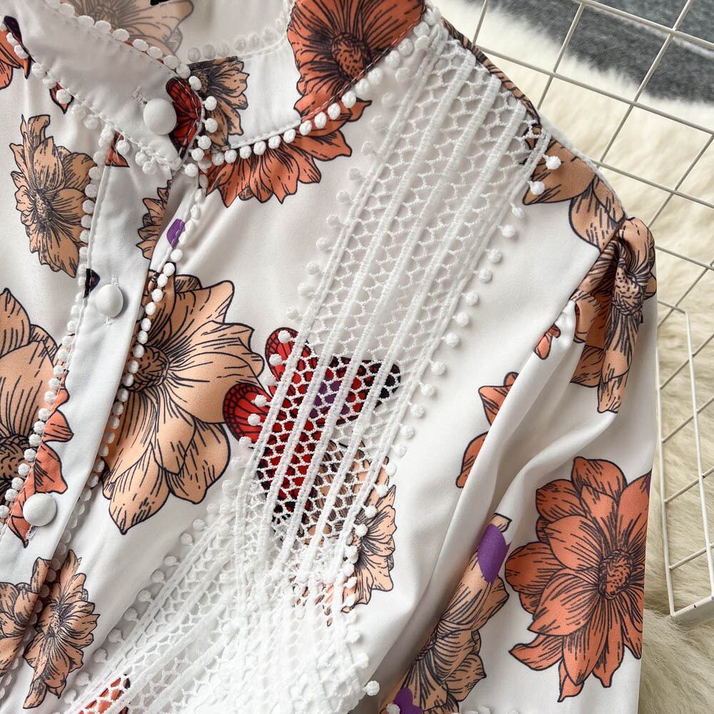 -end light luxury women's clothing lady style lace temperament stand-up collar buttoned lantern sleeves slim A-line dress ランタンスリーブ レース Aライン スリム lyxaj84071407218