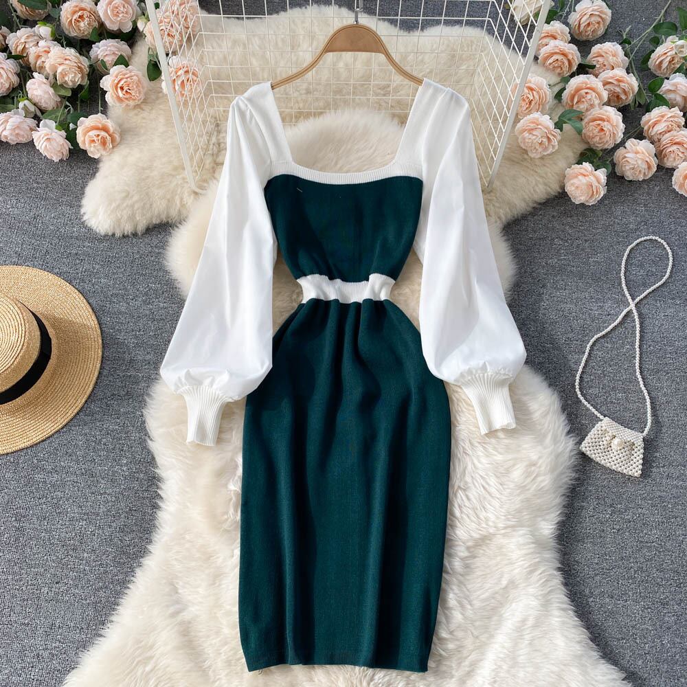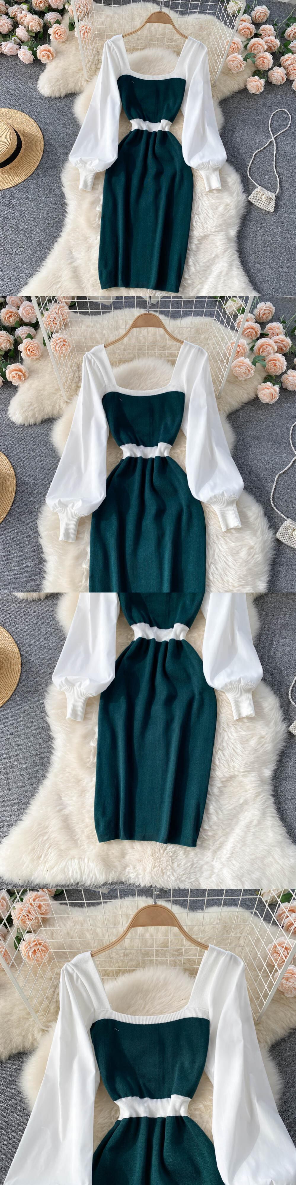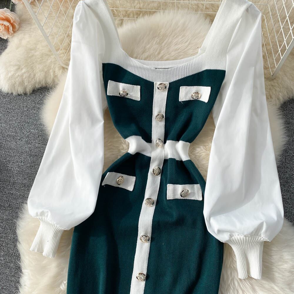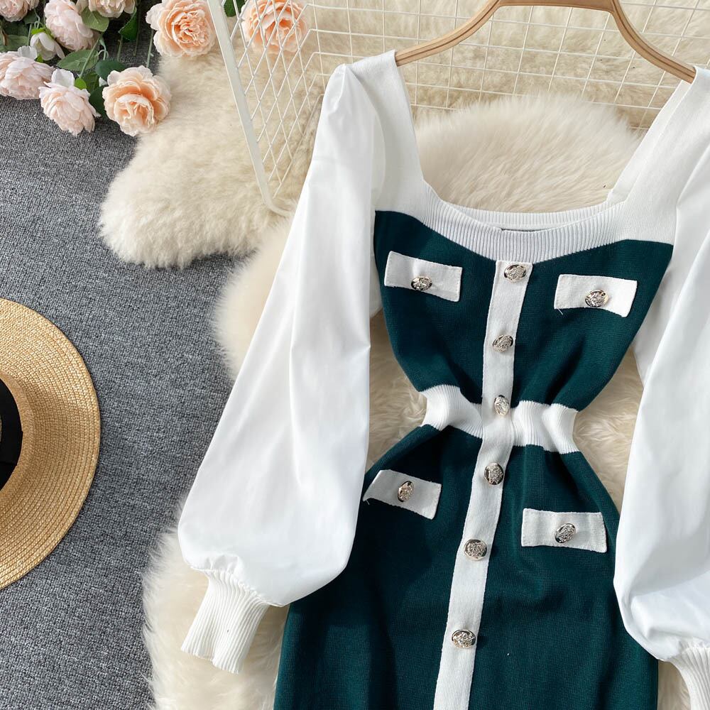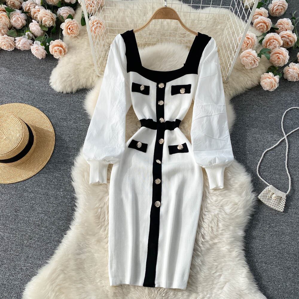 Light mature women's temperament square neck buttoned contrast color knitted dress waist slim lantern sleeve bottoming hip skirt ランタンスリーブ スカート スリム スクウェア lyxaj61610923578