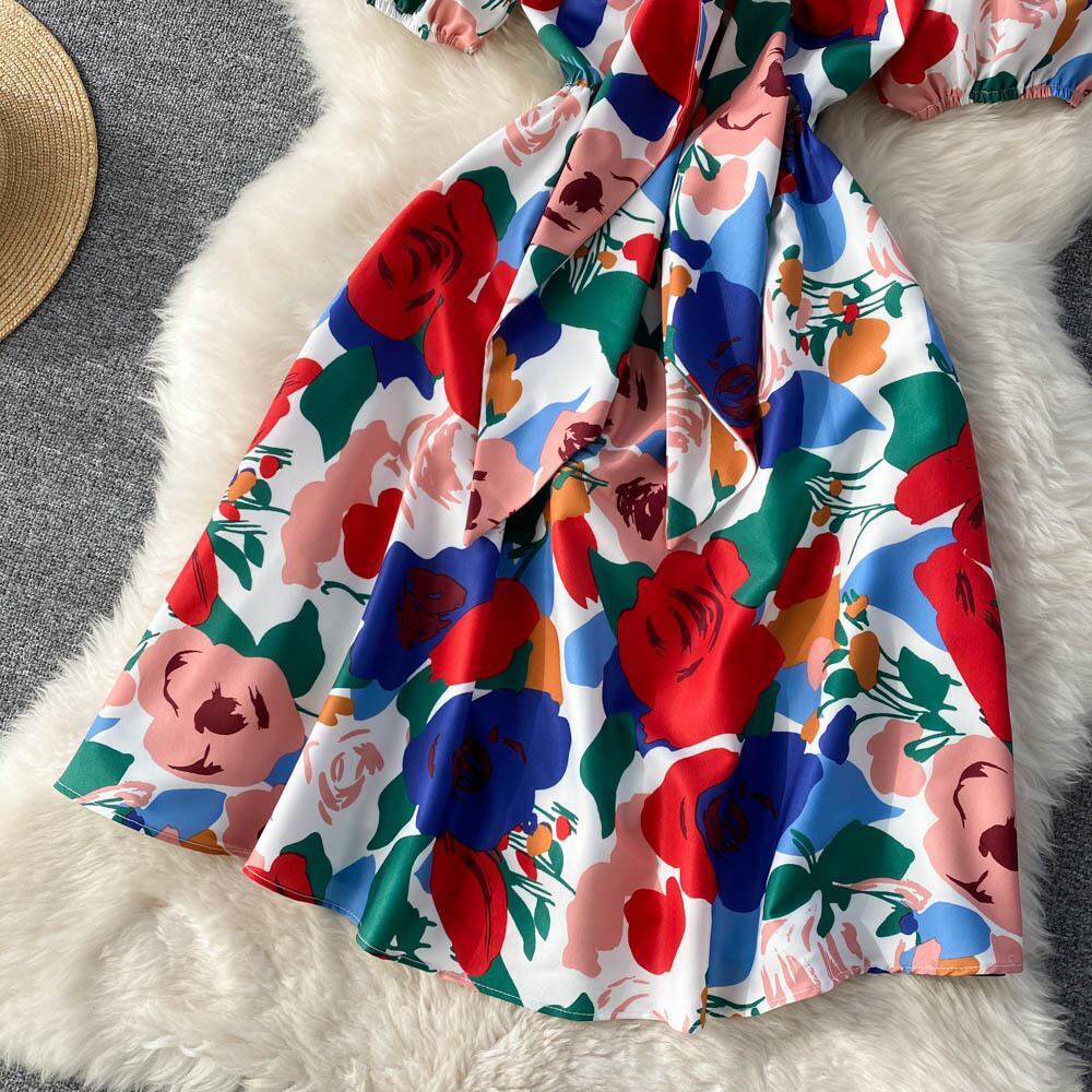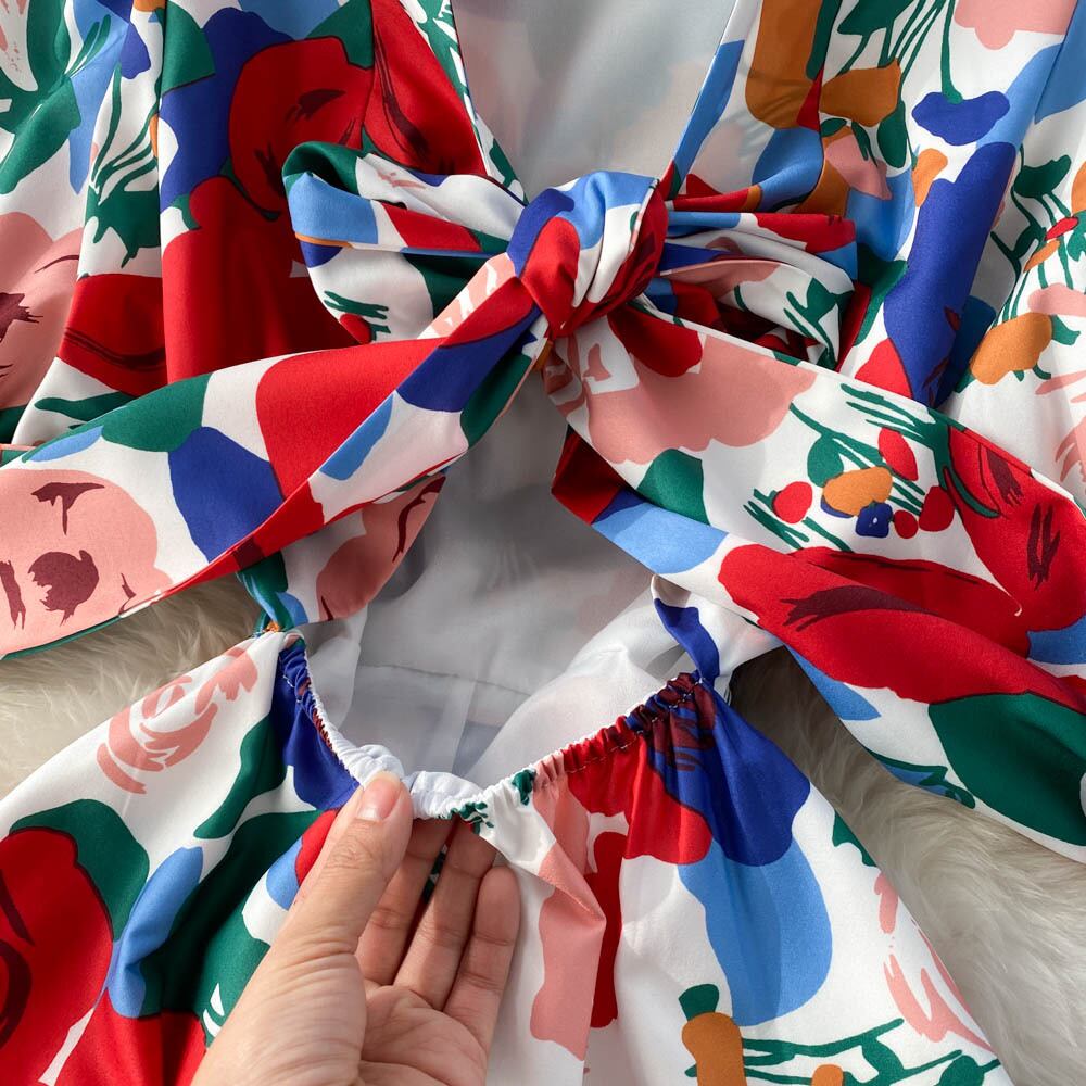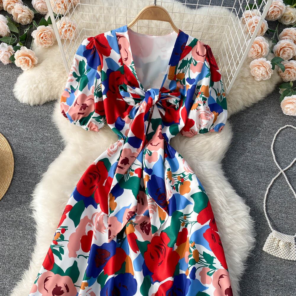 Seaside Holiday Dress Goddess Fan Xinji Strap Deep V-Neck Slim Short Small Printed Skirt ショート プリント スカート Vネック スリム lyxaj52658200226