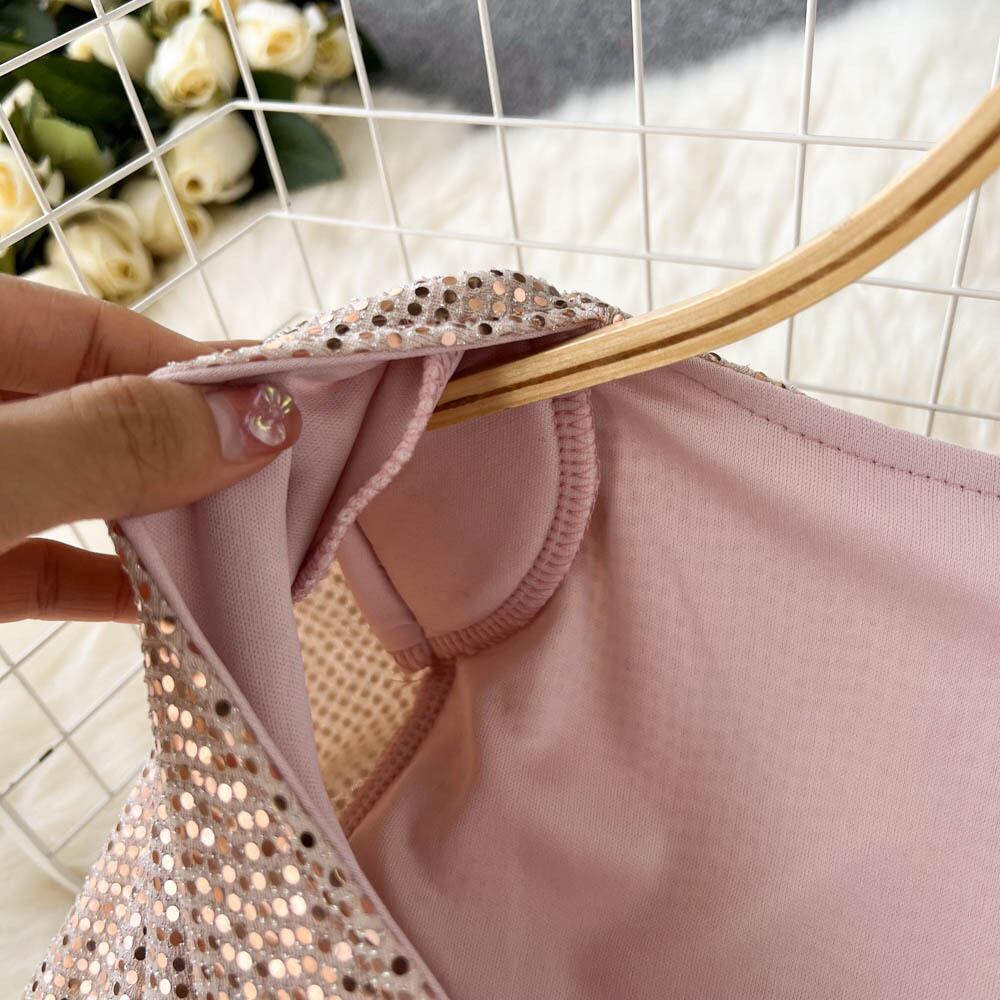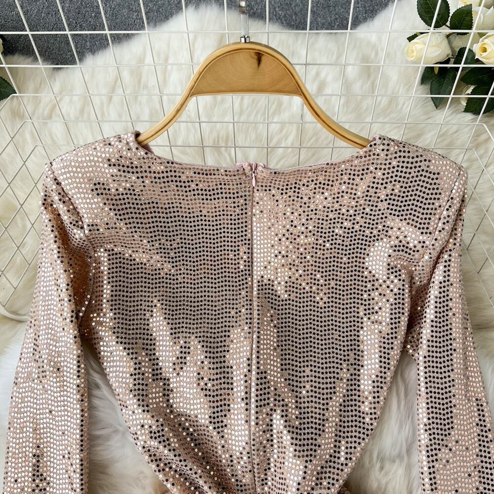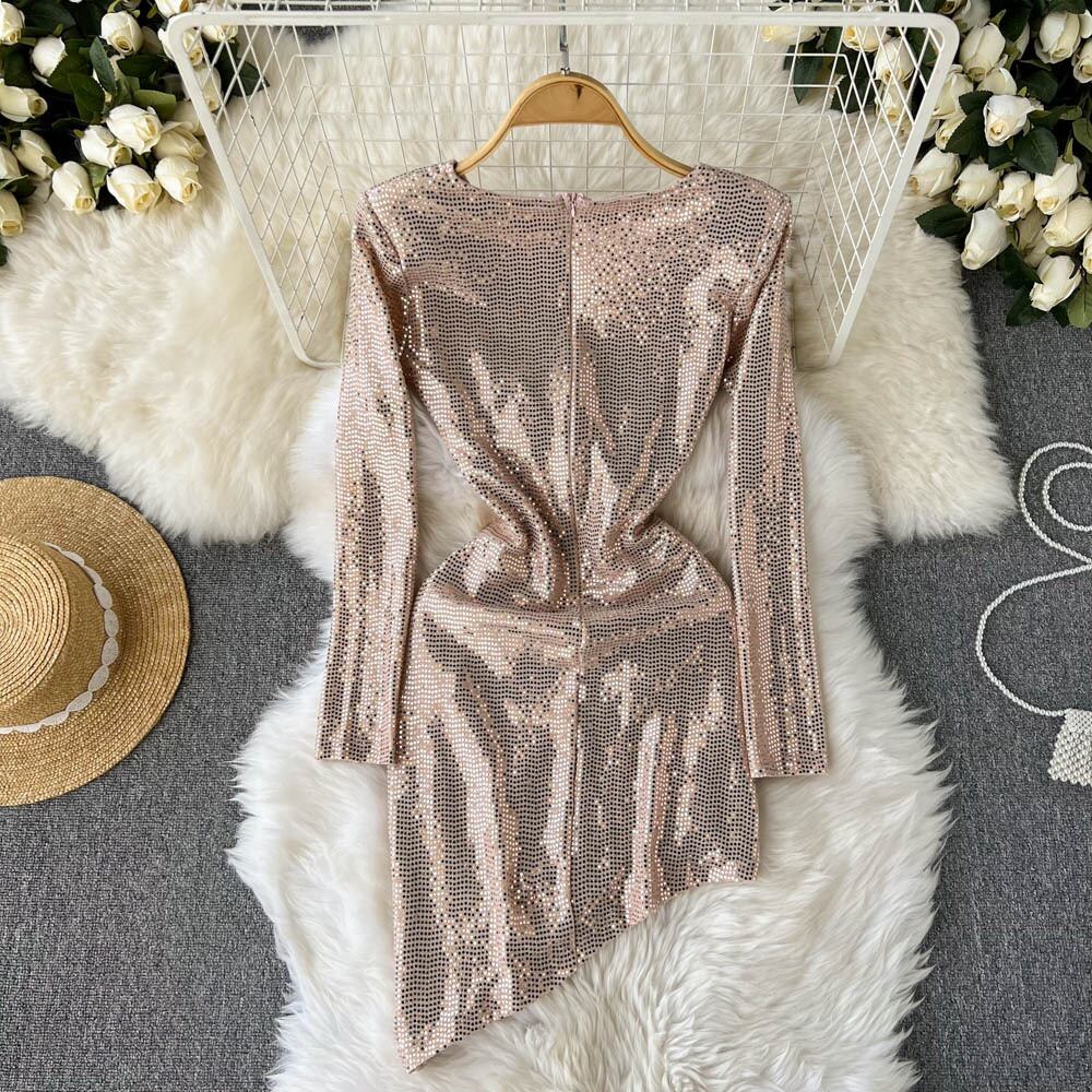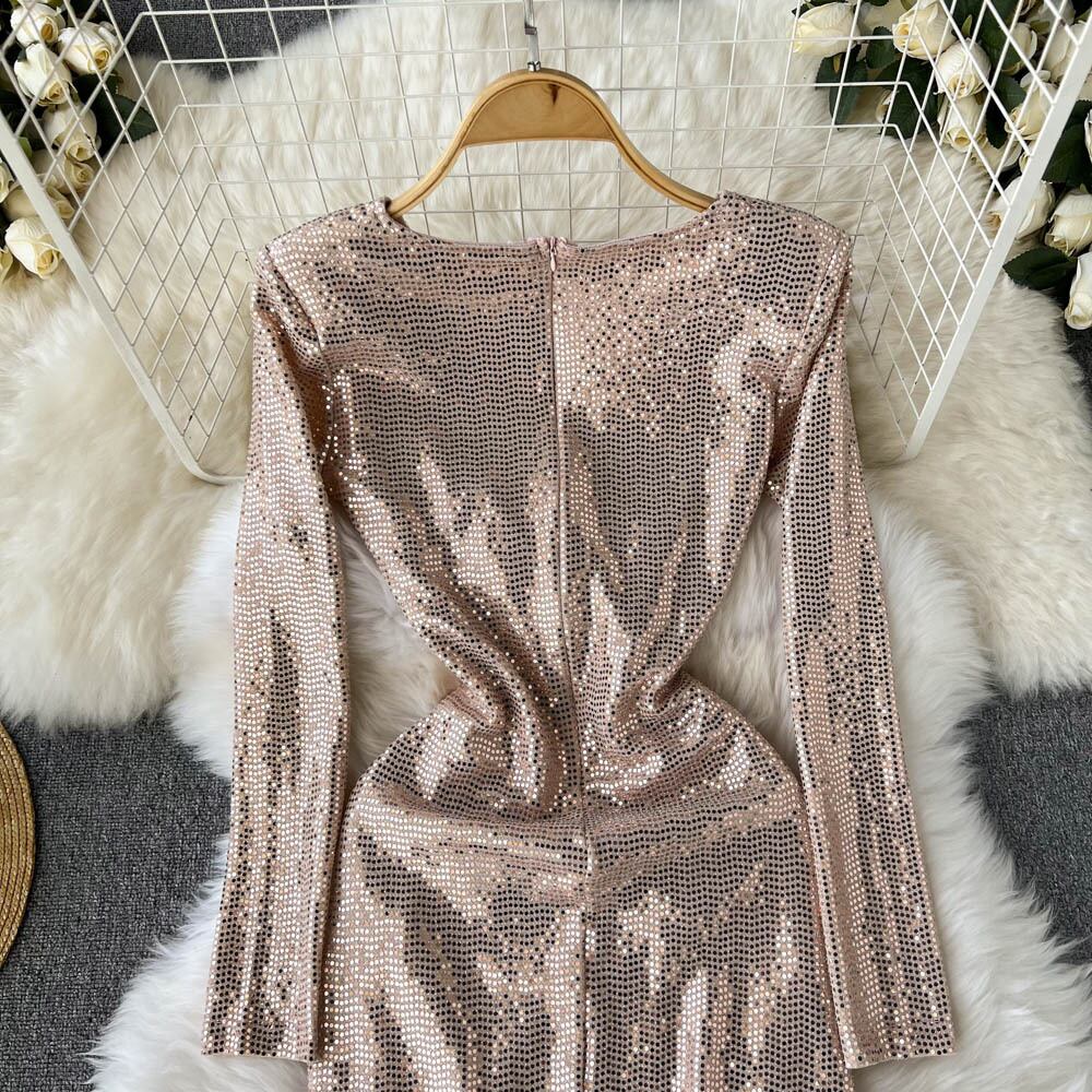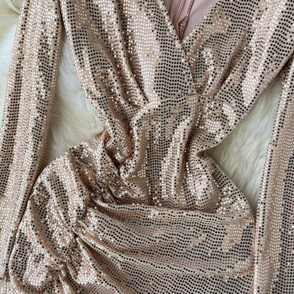 Celebrity temperament V-neck pleated waist French dress women's light luxury sequins high-end package hip party evening dress プリーツ Vネック lyxaj6207128797