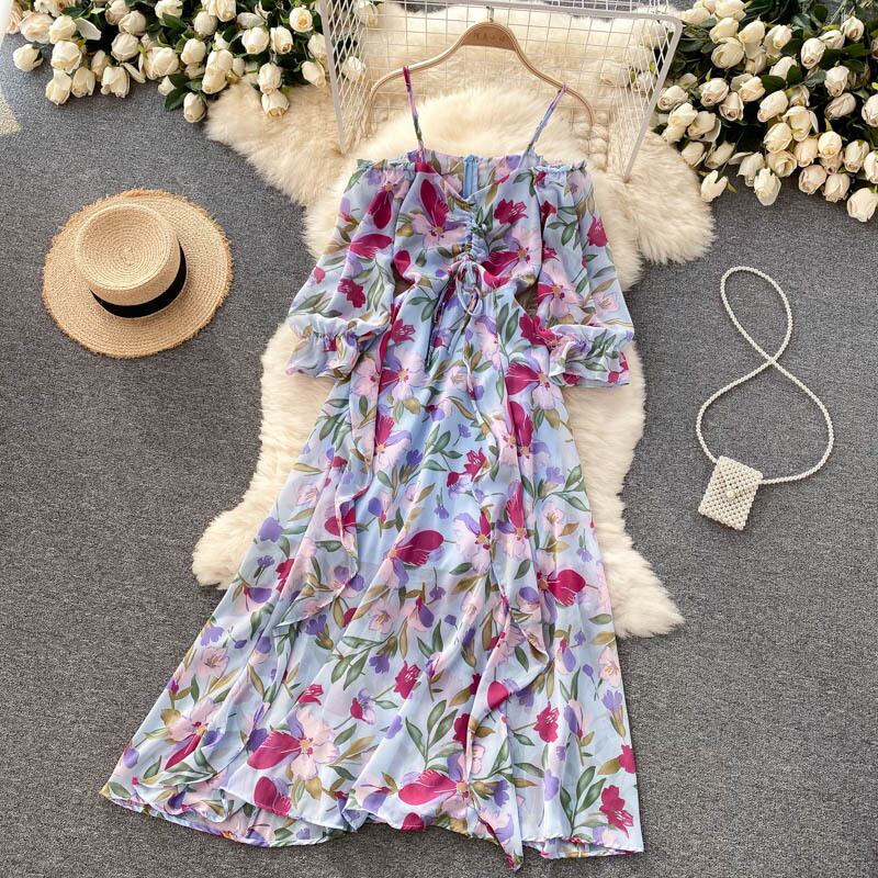 Chiffon dress 2021 new summer women's seaside holiday print sexy leaky shoulder mid-length suspender beach dress シフォン サマー 夏物 ビーチ lyxaj79142067886