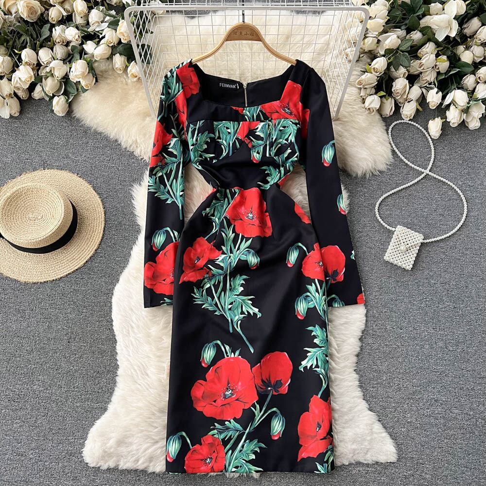 European station 2022 spring catwalk style design collar long-sleeved black bottom printed bag buttocks slim mid-length dress ロング ブラック プリント スプリング 春物 スリム ヨーロピアン lyxaj71756588411