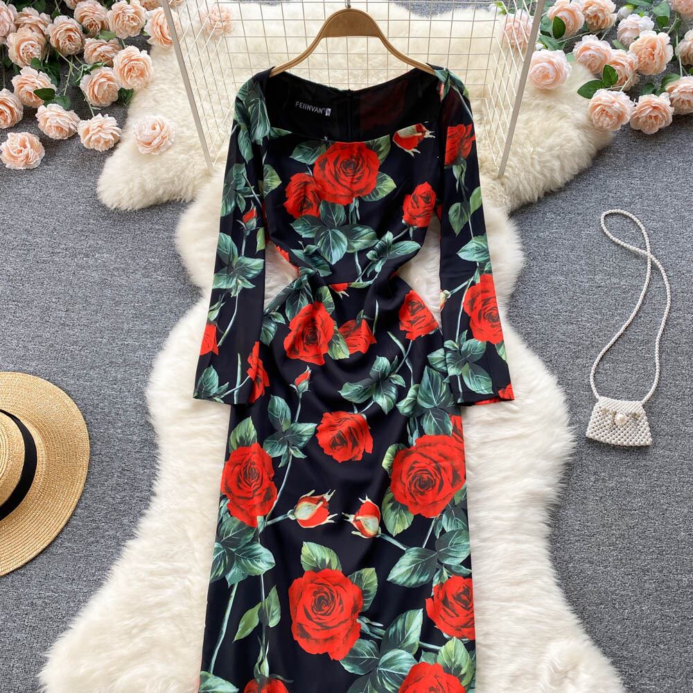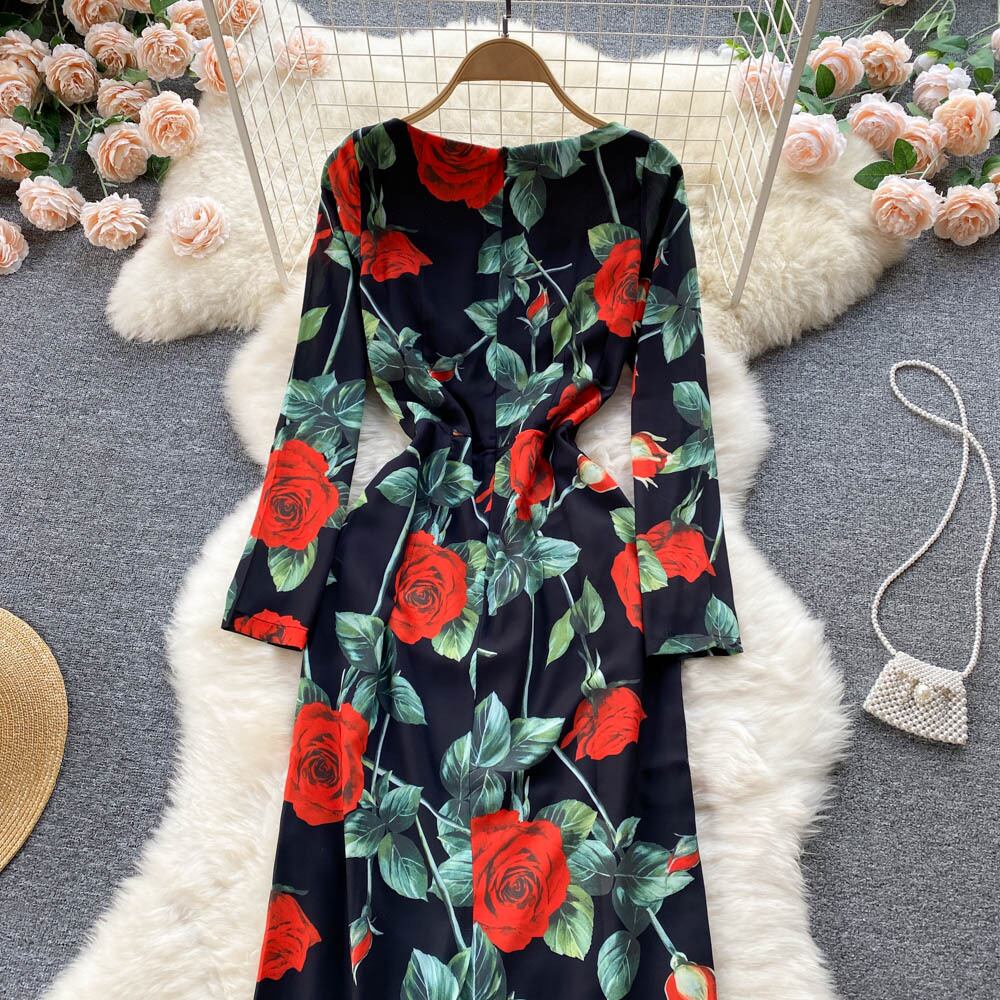 2022 early spring new design sense niche long-sleeved elastic square neck waist bag hip rose print French dress ロング エラスティック 伸縮 スプリング 春物 スクウェア lyxaj23546372175