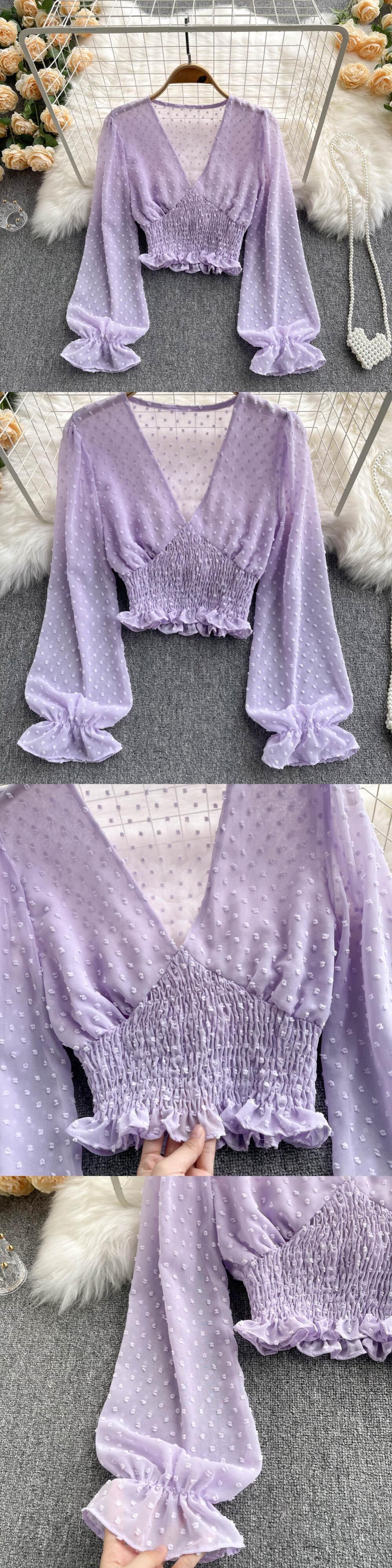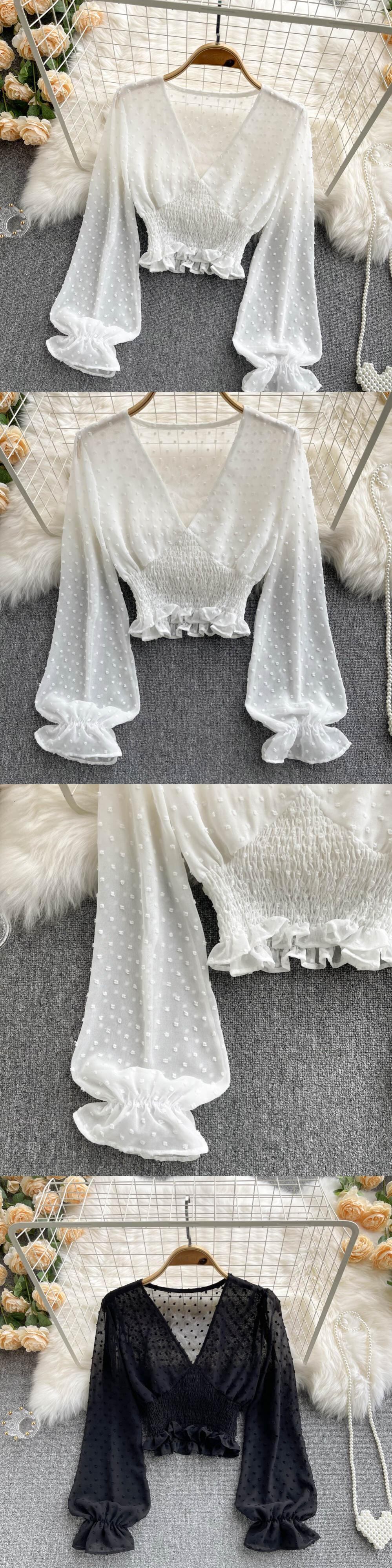 version of the temperament V-neck fungus edge slim short puff sleeve shirt women's design sense niche scheming perspective top ショート Vネック スリム lyxaj47672717949
