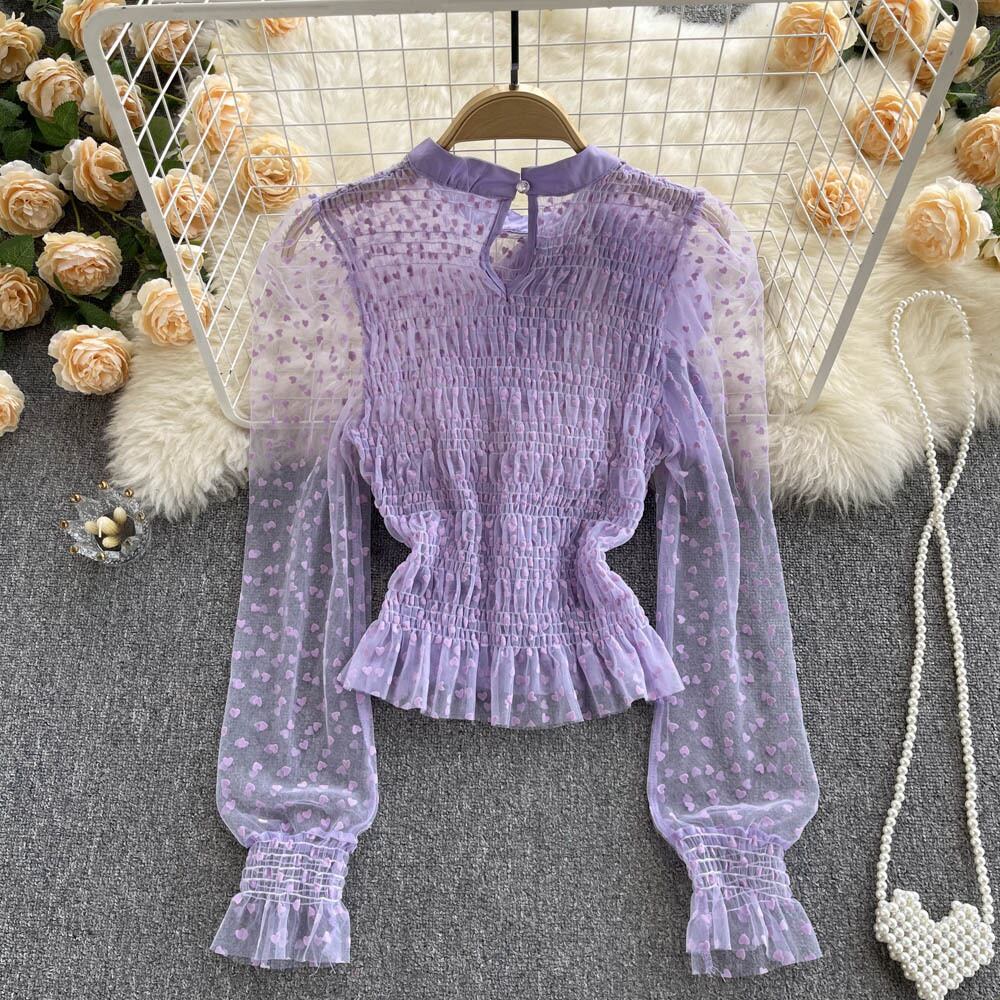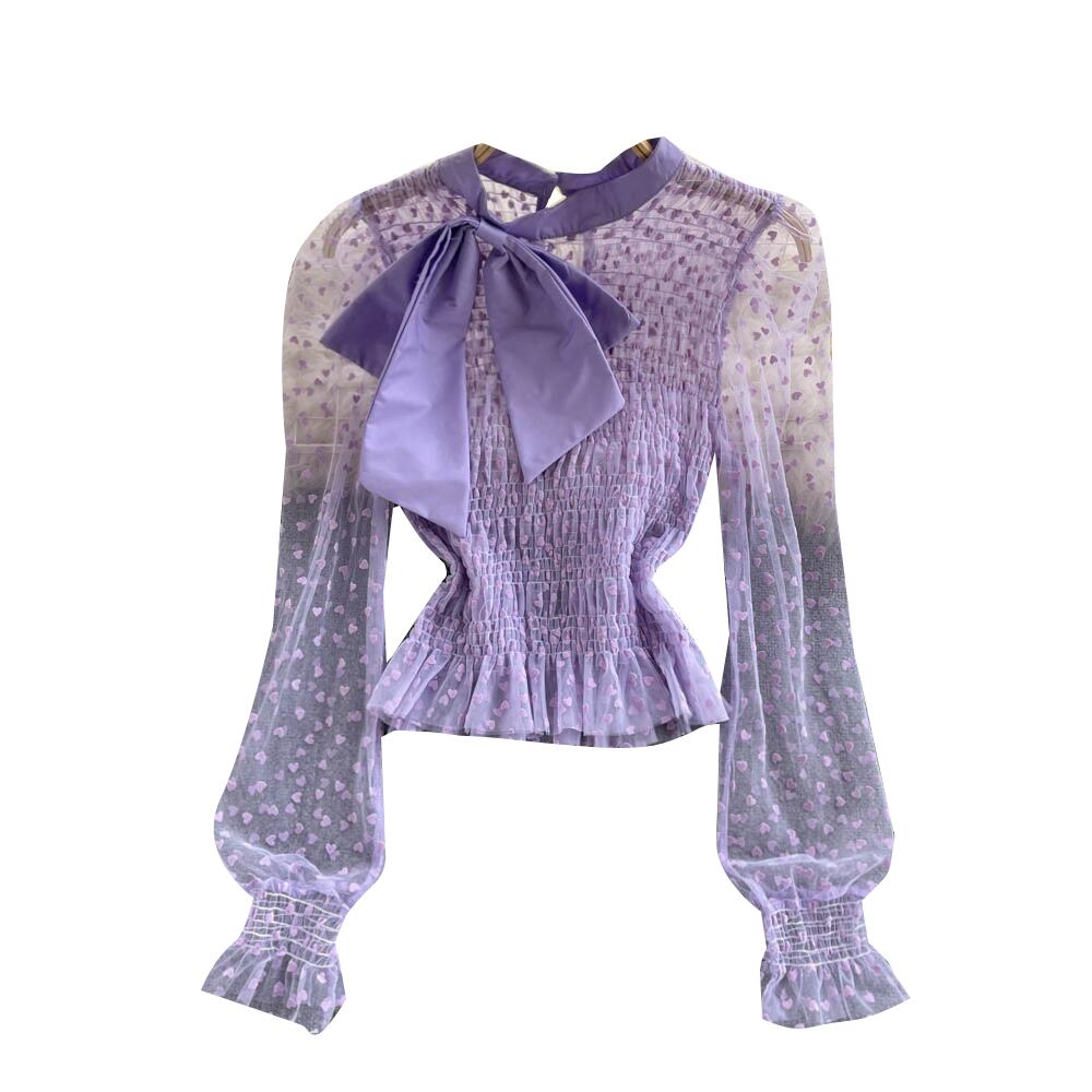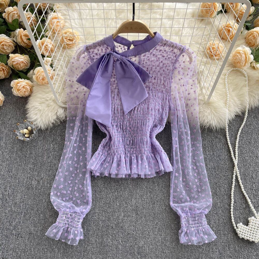 Niche bow design mesh stitching heart-shaped long-sleeved top 2022 spring new slim slim lace shirt ロング リボン レース スプリング 春物 メッシュ スリム ステッチ lyxaj70241521141