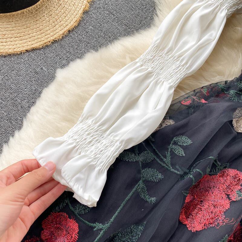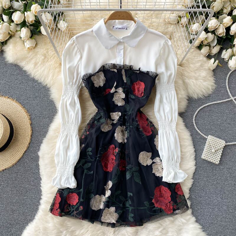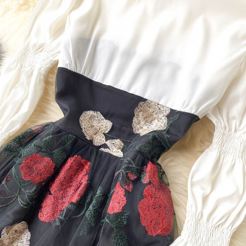 Long-sleeved shirt women's design sense niche contrast color stitching retro heavy industry embroidery mesh dress 2021 new summer ロング レトロ 刺繍 サマー 夏物 メッシュ ステッチ lyxaj42091253350