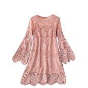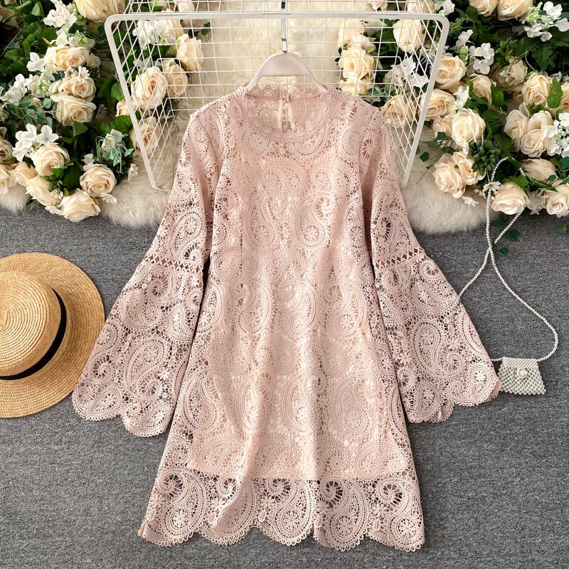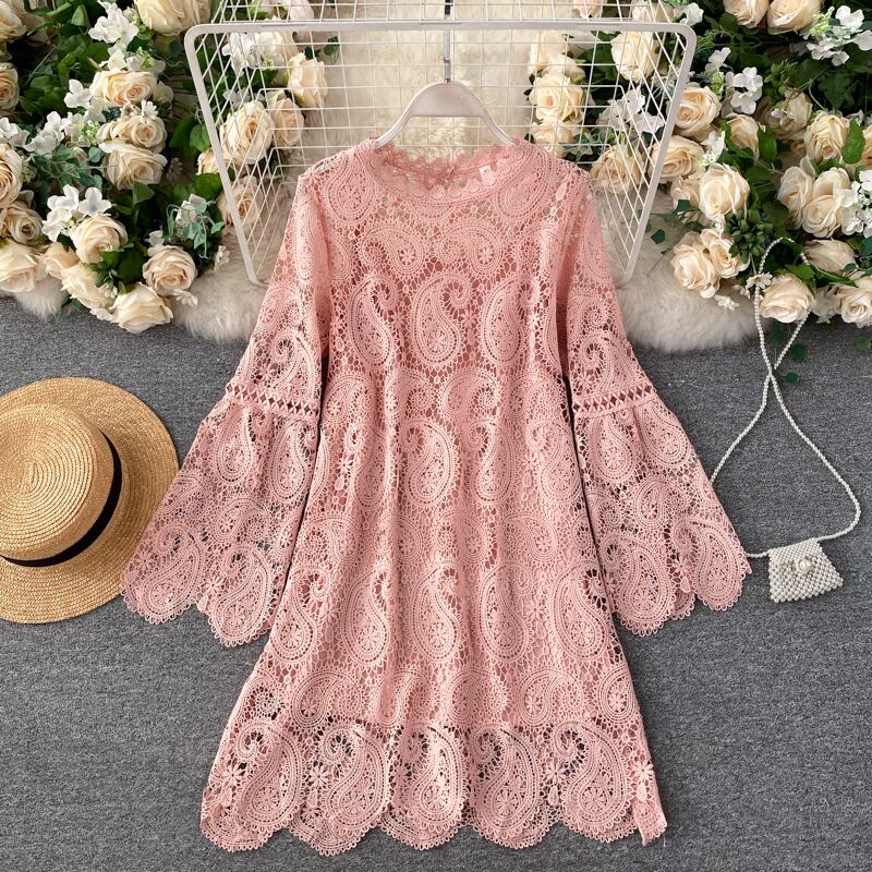Large size women's clothing 2020 new autumn clothes ingenious hollow water soluble lace trumpet sleeves loose short temperament dress ショート レース 大きめサイズ オータム 秋物 lyxaj37131259096