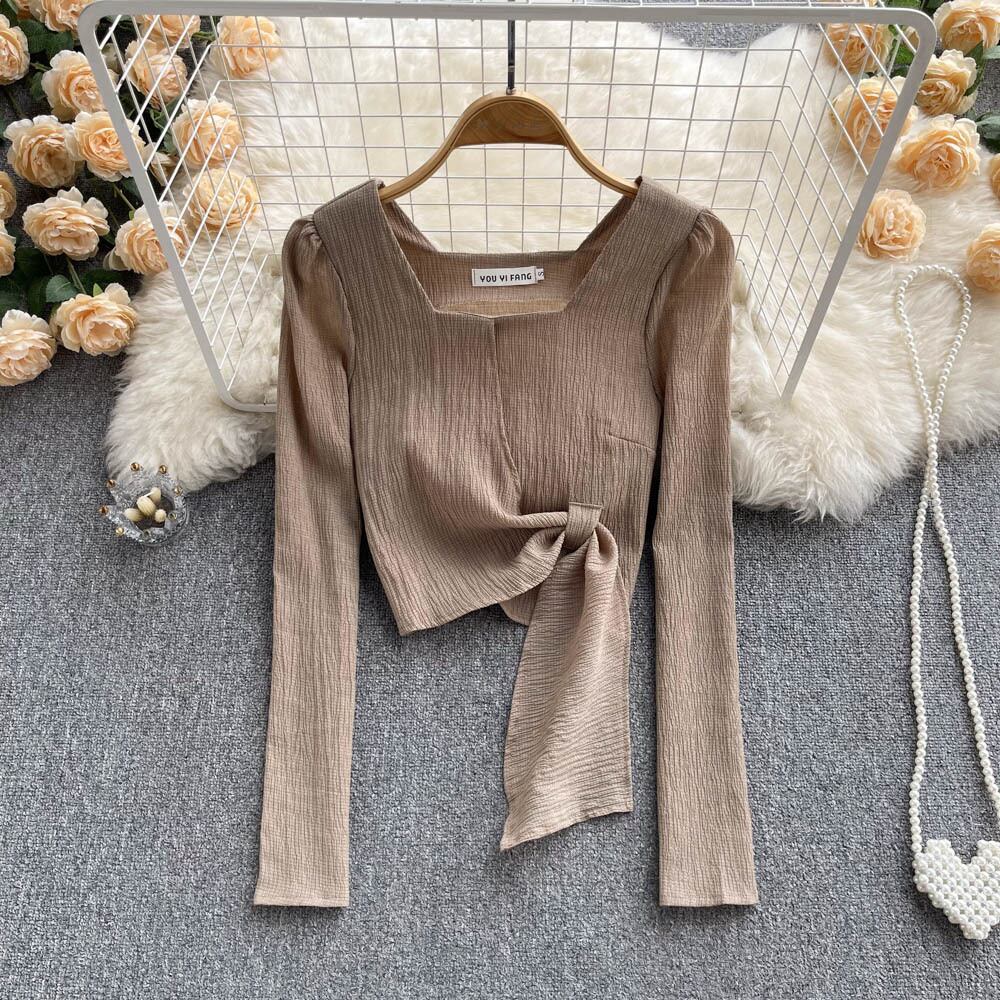 chic spring retro slim square collar irregular tie irregular design loose long-sleeved shirt top ロング レトロ スプリング 春物 スリム スクウェア lyxaj54871018605