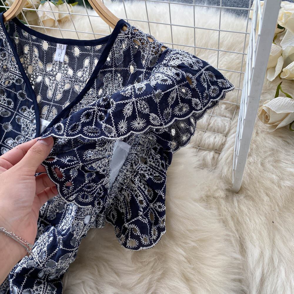 French temperament hollow embroidery contrast color V-neck waist dress small mid-length elegant flying sleeve A-line skirt 刺繍 エレガント スカート Vネック Aライン lyxaj63752099058