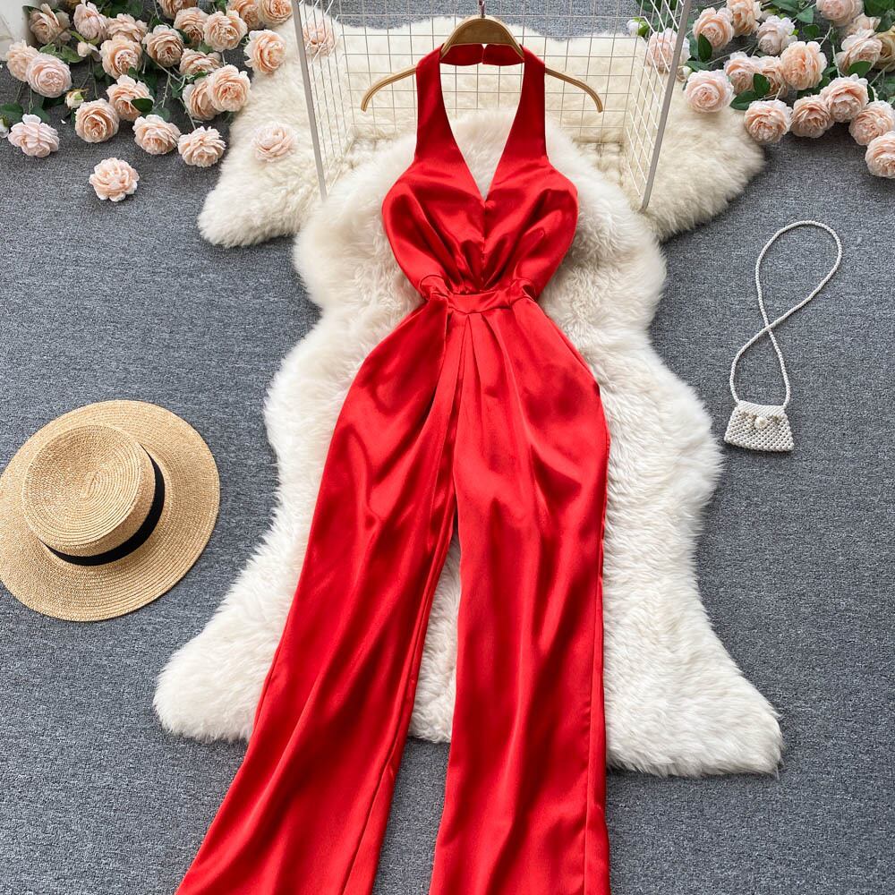 2022 summer new fashion temperament V-neck hanging neck high-waisted thin lace straight wide-leg trousers jumpsuit women レース サマー 夏物 Vネック lyxaj73869924825