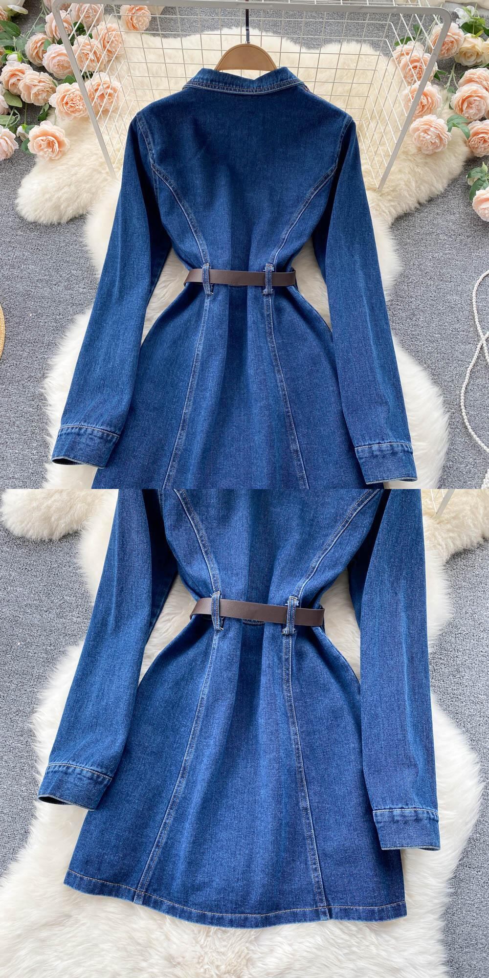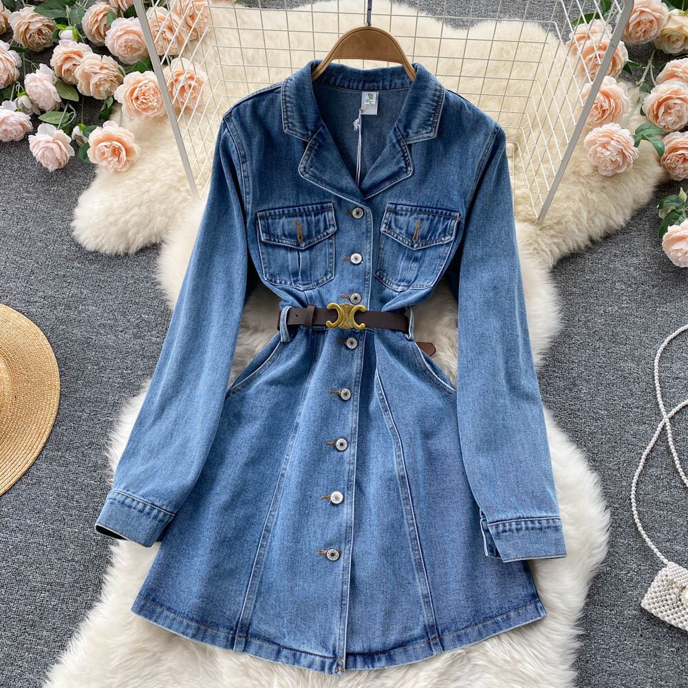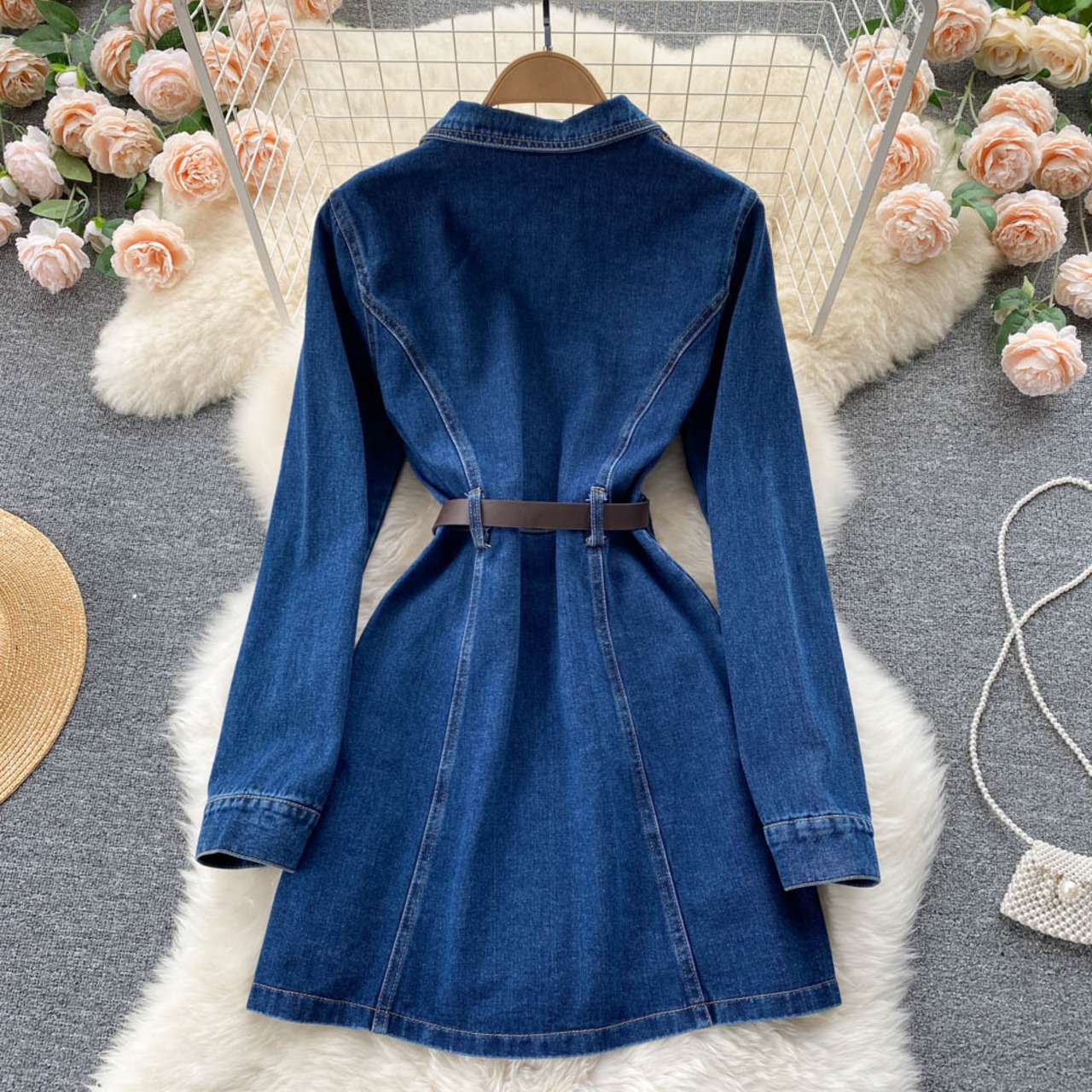 chic Hong Kong style retro denim skirt temperament breasted slim fit long-sleeved dress women's autumn and winter bottoming skirt trend ロング レトロ オータム 秋物 ウィンター 冬物 スカート スリム lyxaj9885130506