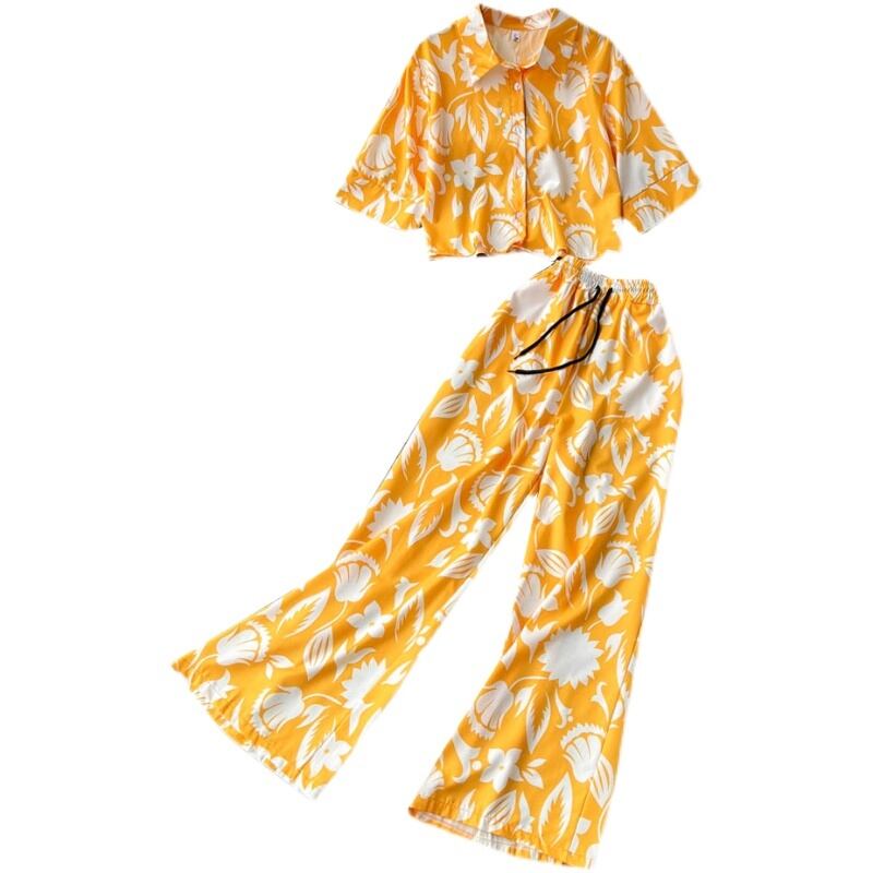 Holiday style Western print short-sleeved polo collar shirt straight loose casual wide-leg long pants two-piece suit women ロング カジュアル lyxaj83520834753